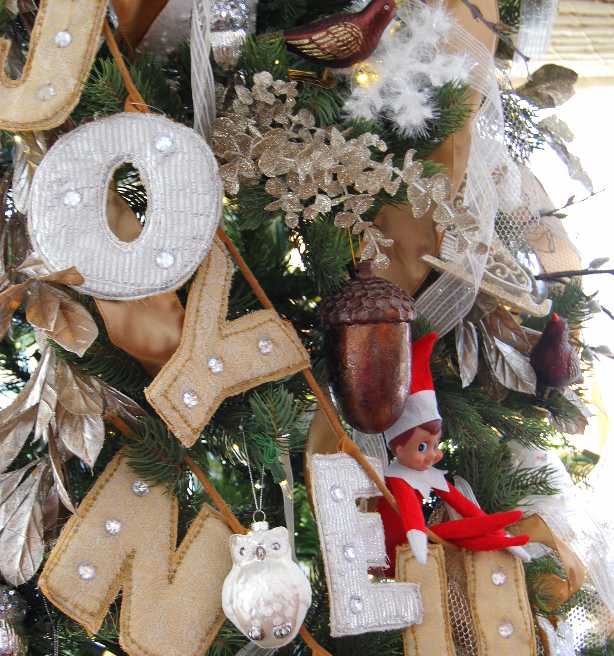 (As luck would have it, our Elf on the Shelf, “Henrie-Rouge” decided that he wanted to hang out in the newly-decorated tree on the very day I wanted to take a few pics.)