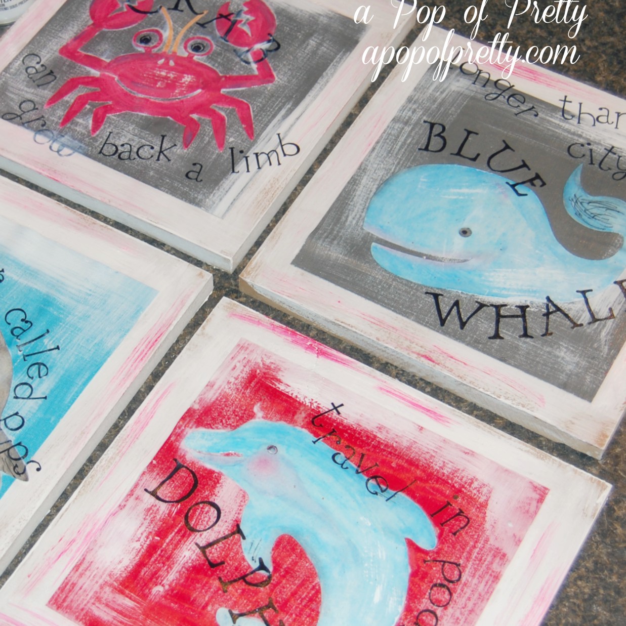 The sea theme reminded me of my Pottery Barn Kids ‘Surf Plaque’ Knock Off Project from a year and a half ago. For that project, I also used die cut sea creature shapes (cut from my Silhouette) and Mod Podge to create wall art for my kids’ playroom. You can find the tutorial by clicking here.