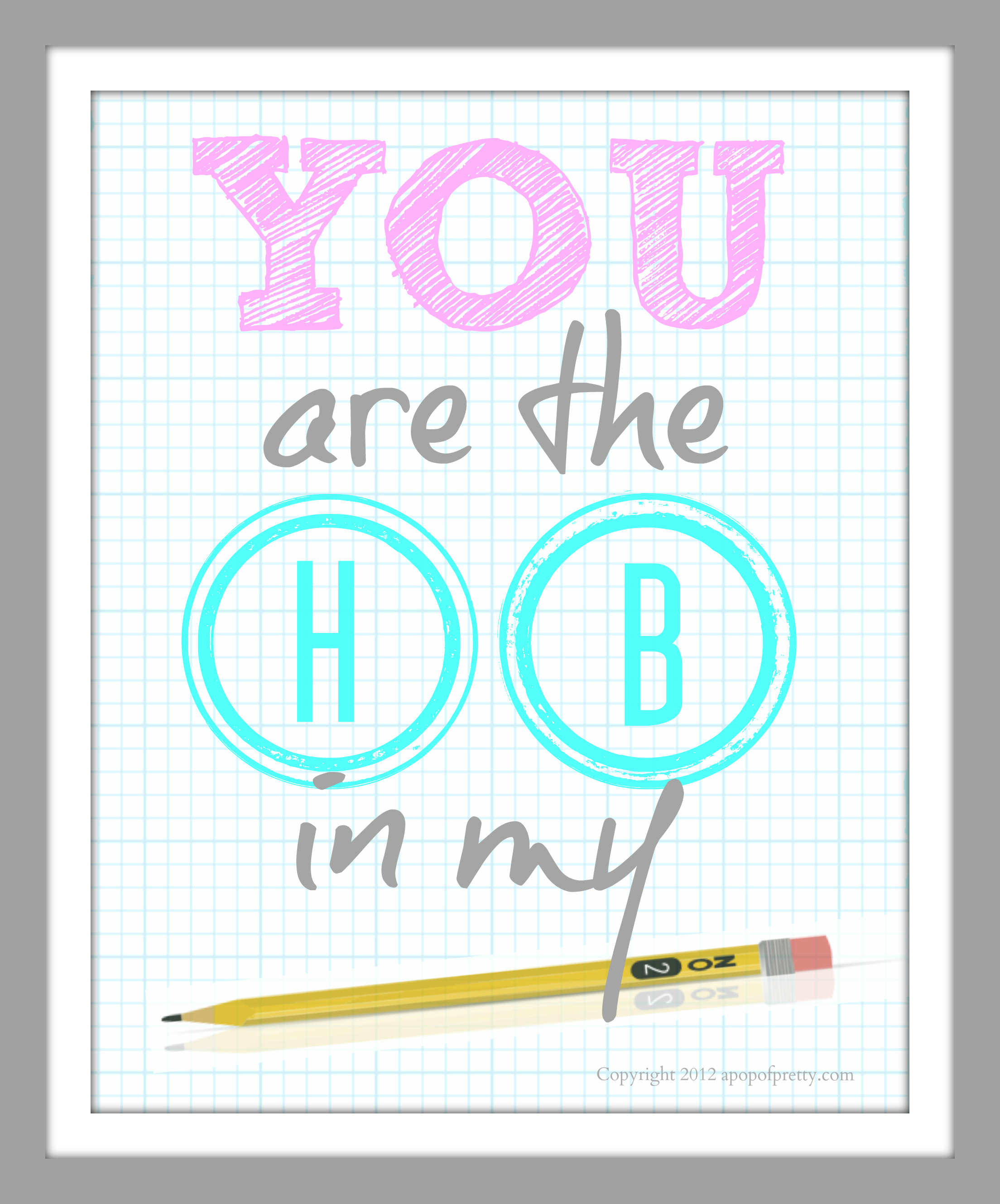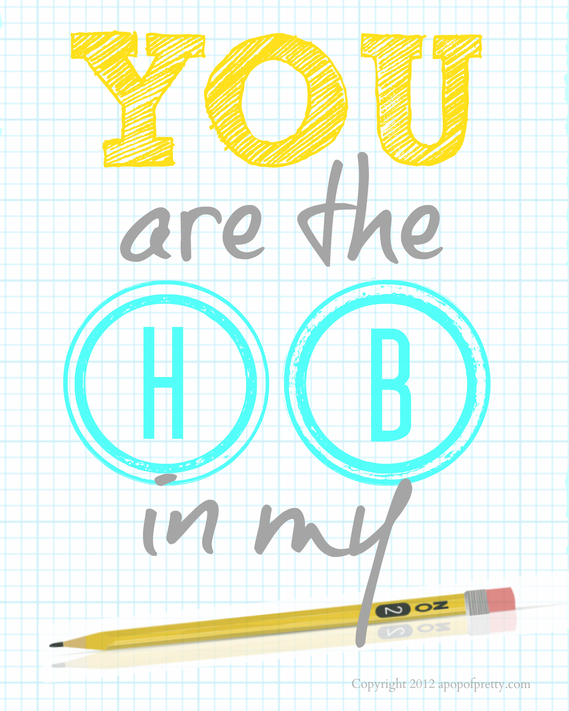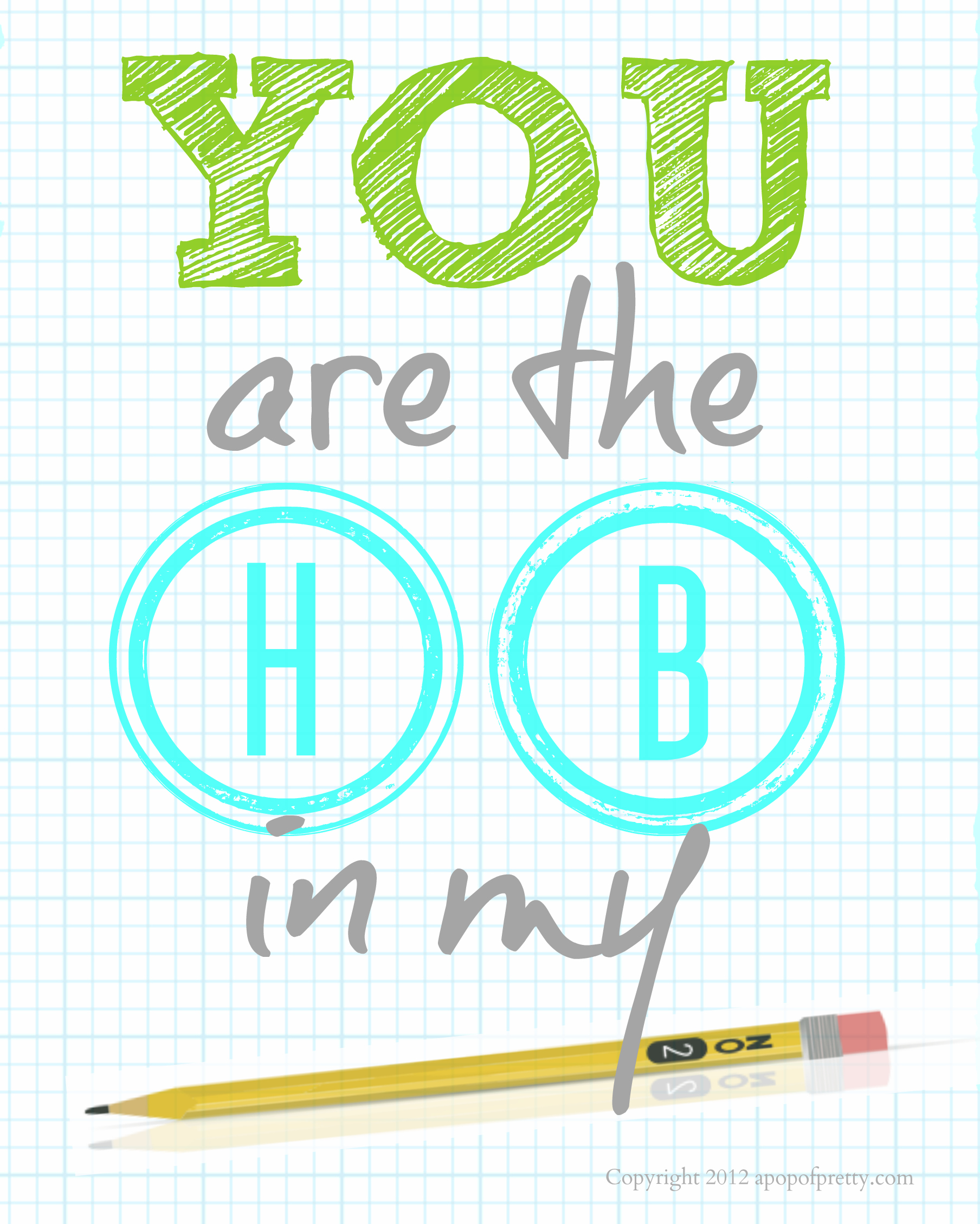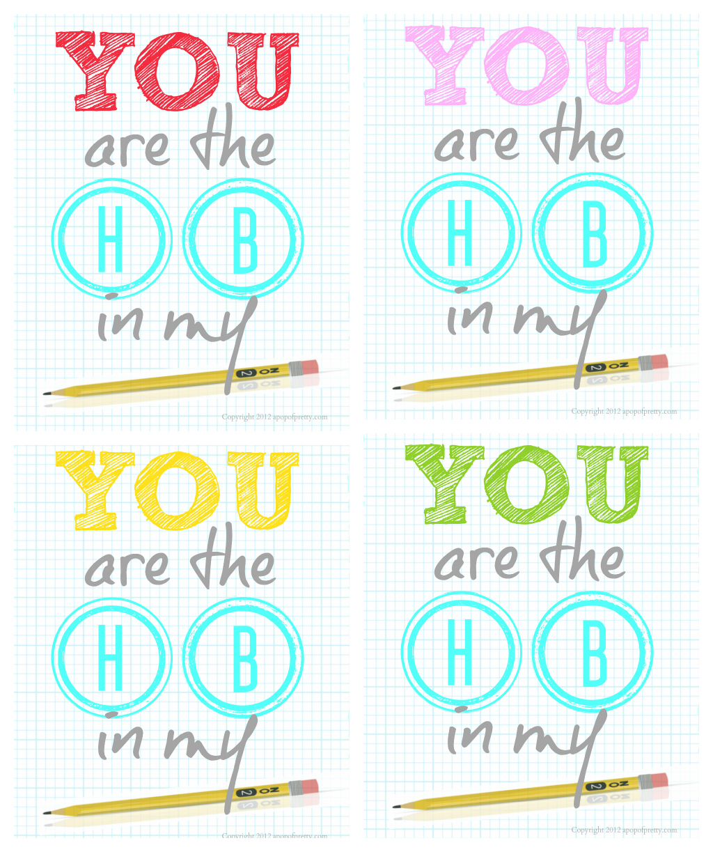 What school parent hasn’t experienced the mind-numbing boredom of sharpening a bottomless pit of “No. 2 HB pencils” the night before the first day of school? When you think about it, the scene is pretty comical. The things we do for love, lol! ( This year, I bought pre-sharpened pencils!) The line “You are the HB in my pencil” popped into mind, and I decided to create this little back-to-school printable which I’m offering as a free download for my readers. I also created a companion piece, which I’ll try and post tomorrow!