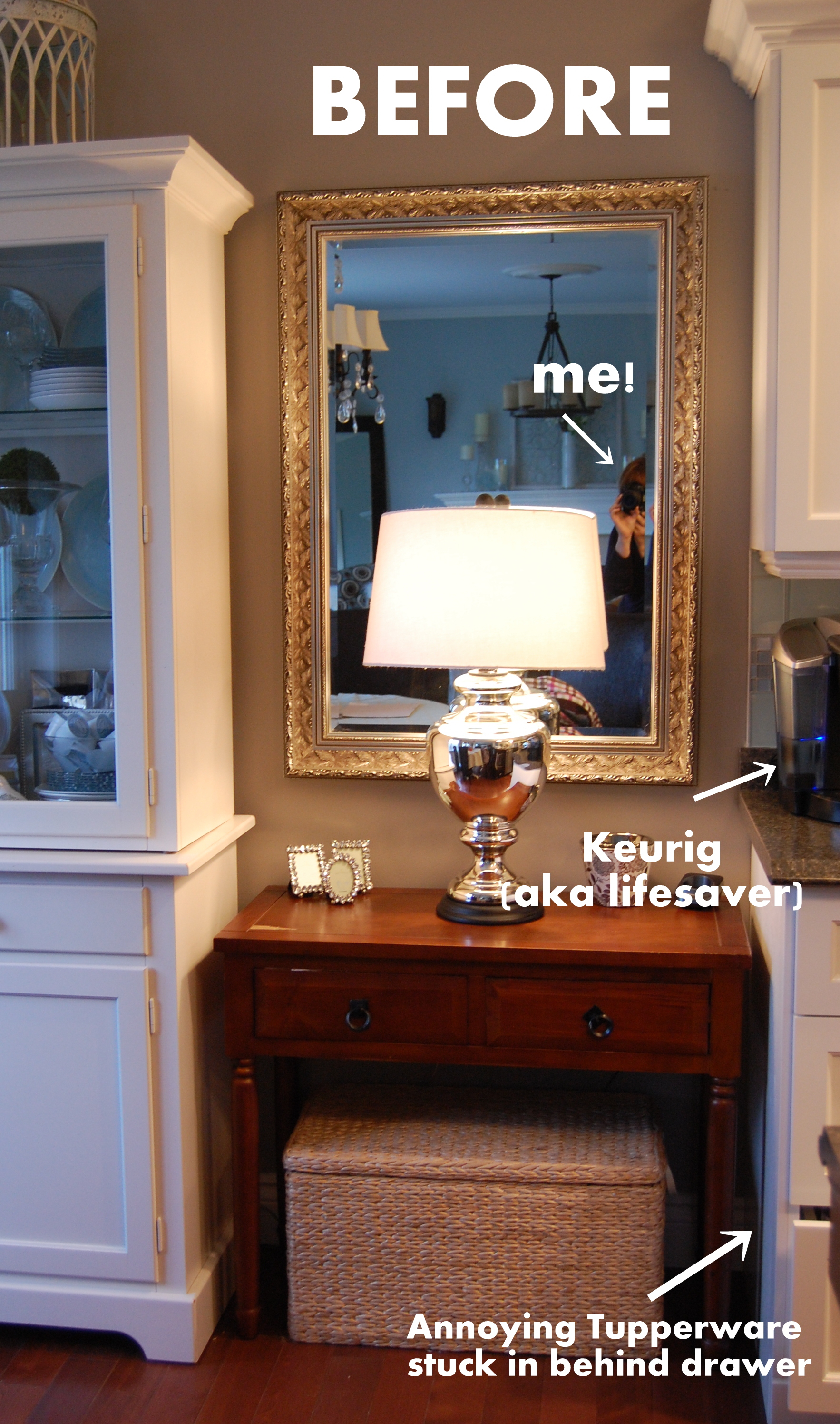 And, the perfectly fitting console table is also perfectly in balance with the mirror above it – hooray! End of story, right? If you’re still with me here and paying attention, you might notice that the photo of this perfectly fitting console table says ‘BEFORE’. Yup, people, that means my story isn’t over yet. There’s an ‘AFTER’ coming, lol.