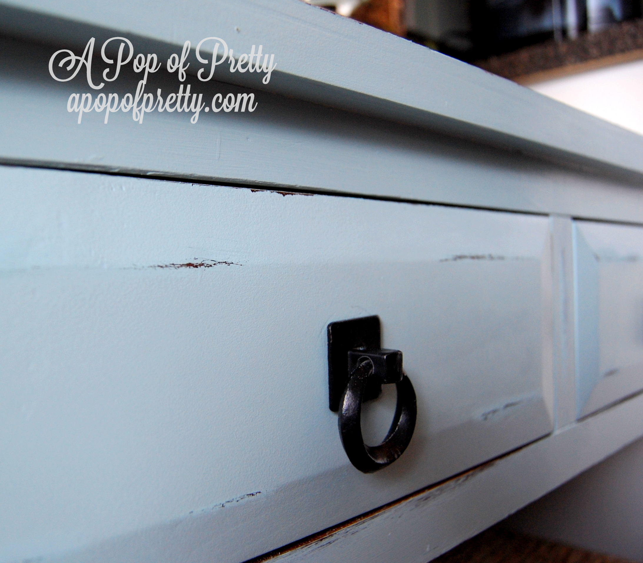 The color is Martha Stewart’s Artesian Well mixed as a Behr latex formula with primer built in (’cause personally I like painting furniture with Behr). After two coats, I distressed the edges a little with some sandpaper.