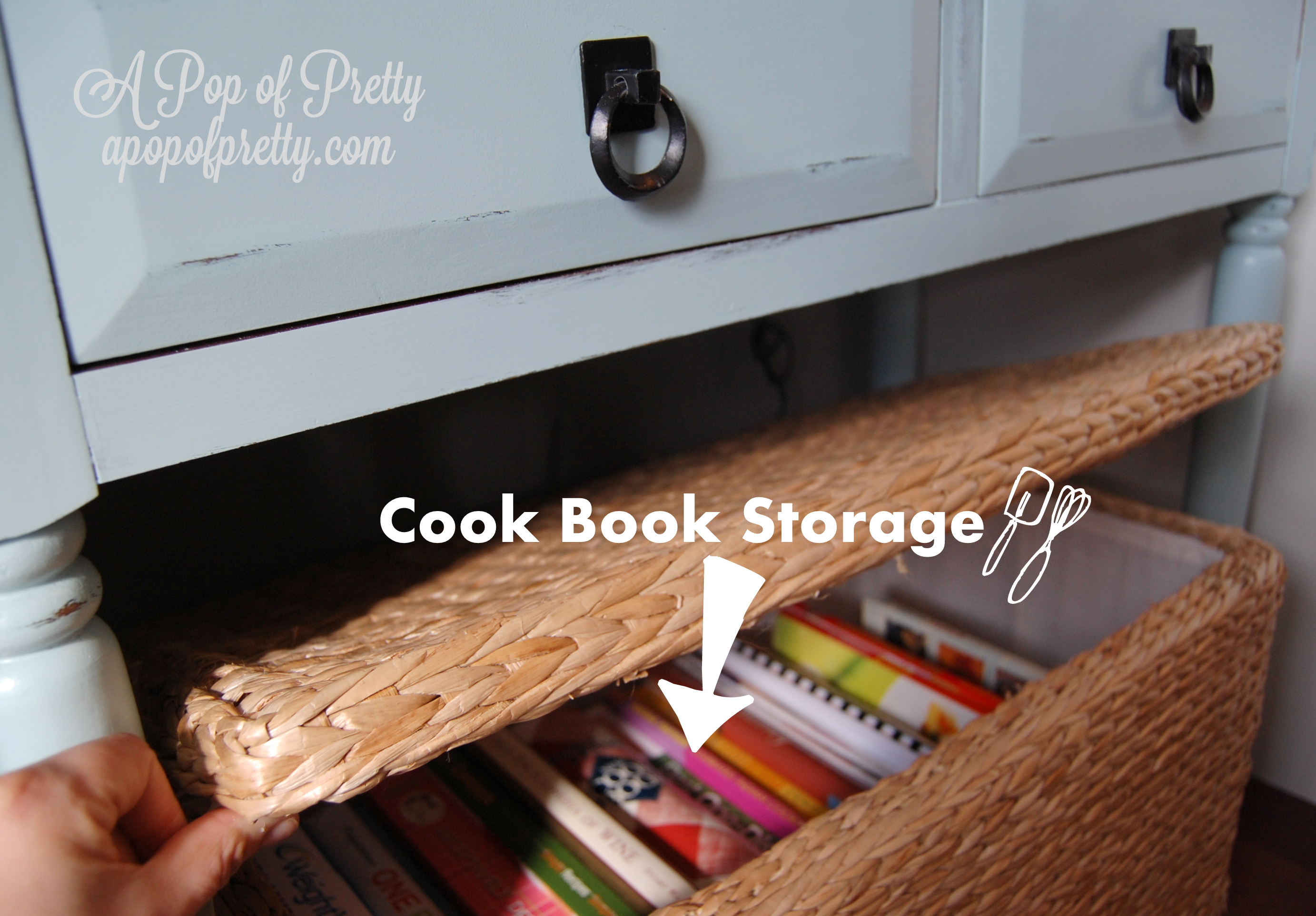 And, as an added bonus, one of my baskets fits perfectly under the table, and it fits all my cookbooks. I did store them in one of my higher kitchen cabinets, but that meant that they weren’t easily accessible. Now, they’ll be at my fingertips when I get the time and motivation to cook another gourmet meal , like, in 2017 ;-).