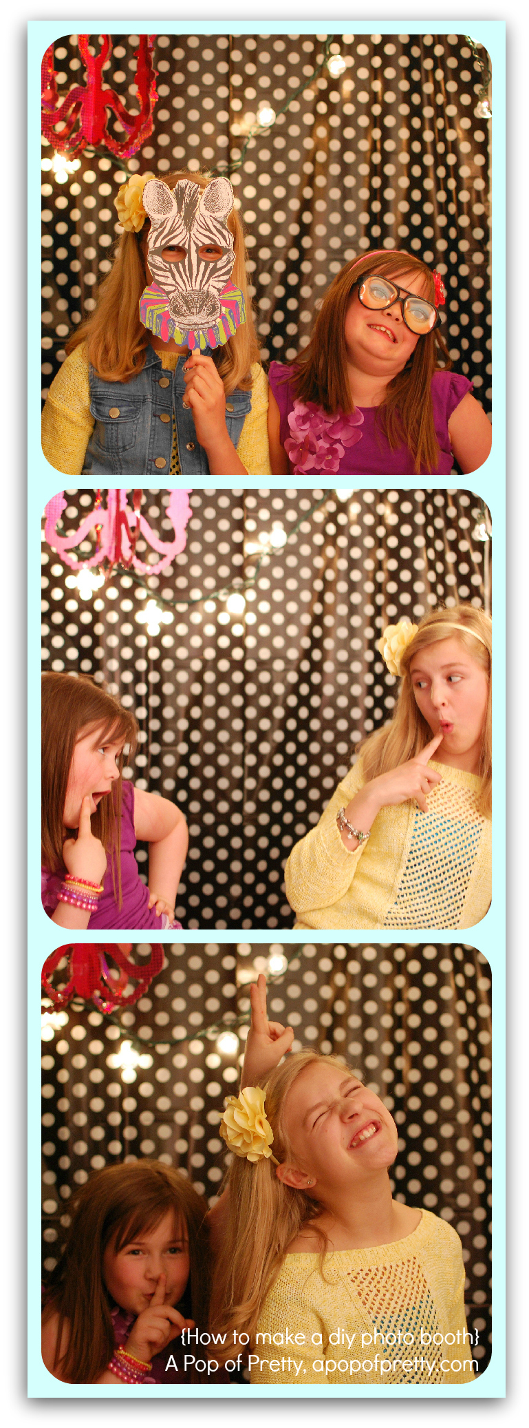 Photo booths are pretty trendy right now, so I knew I couldn’t be the only one crazy enough to think I could make one on my own! I did some research, and then came up with a plan for creating a diy photo booth that met our particular needs – i.e., one that could withstand the acrobatics of 10 tween-aged girls!