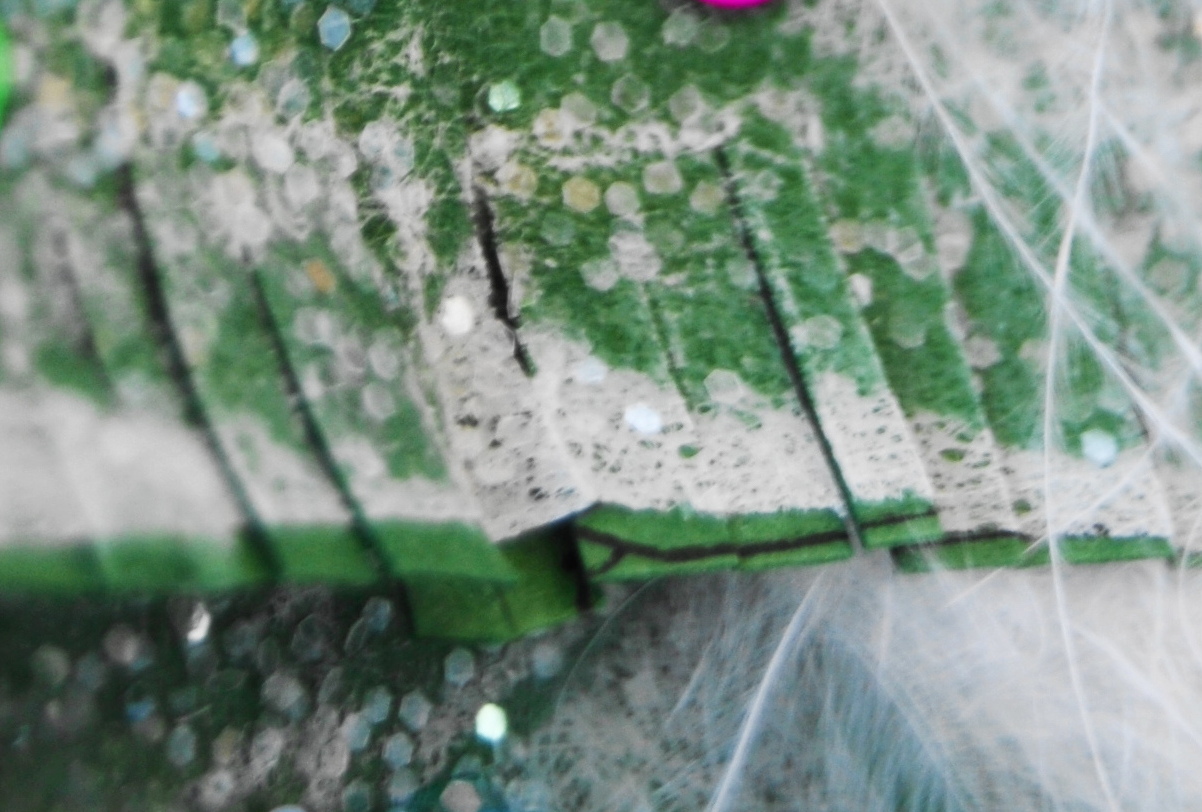 STEP 4: Glitter it! In this step, you will create the pretty frost on the tree! On one side of your juice box, apply a generous amount of Weldbond glue over the top of the paper triangles, and spread it with a Popsicle stick so it almost completely covers the surface of the triangles, except the edge. Immediately press your first set of 3 dryer sheet triangles over the top of the glue, matching them up against the paper ones. The glue will come through the dryer sheets, but that’s what needs to happen. Now, take your glitter and sprinkle it generously over the top of the dryer sheet triangles. Repeat on the other side! Once dry, use your scissors to snip the edge into a ‘fringe’ effect on the bottom of each triangle.