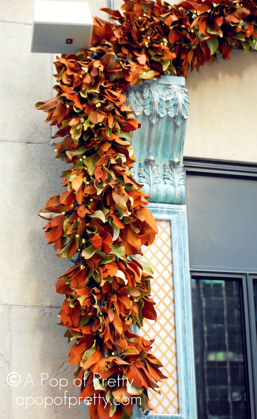 Ever since we visited NYC just before Christmas last year, I’ve been crushing on the idea of using magnolia leaves in holiday decorating. There’s just something ‘0h-so-Martha’ in the natural simplicity of a magnolia wreath or garland. Magnolia garlands and wreaths seemed to be everywhere in The City, but this particular display on 5th Ave was the most inspiring…
