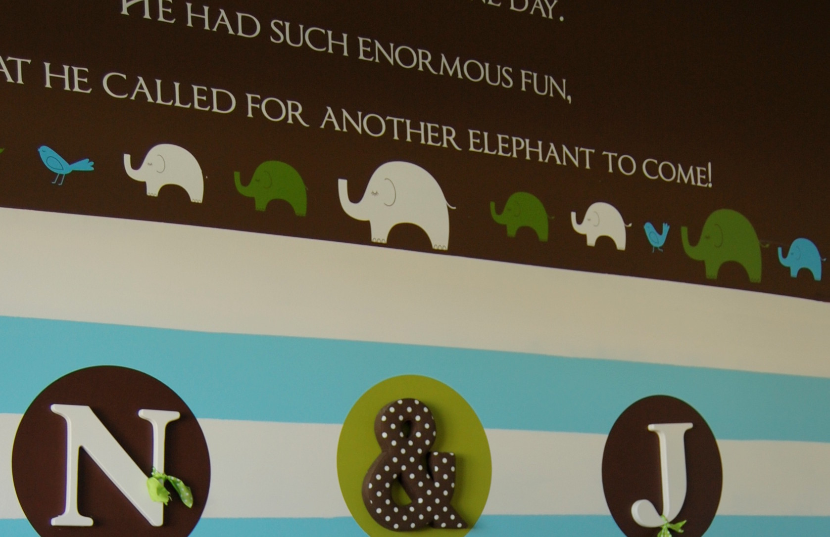 The company I used at the time was called WallQuotes.com, but I am sure there must be other great customized vinyl quote cutters out there too. The addition of the mod elephants, birds and spiders in the little elephant parade were sourced from another supplier, vinylwallart.com.
