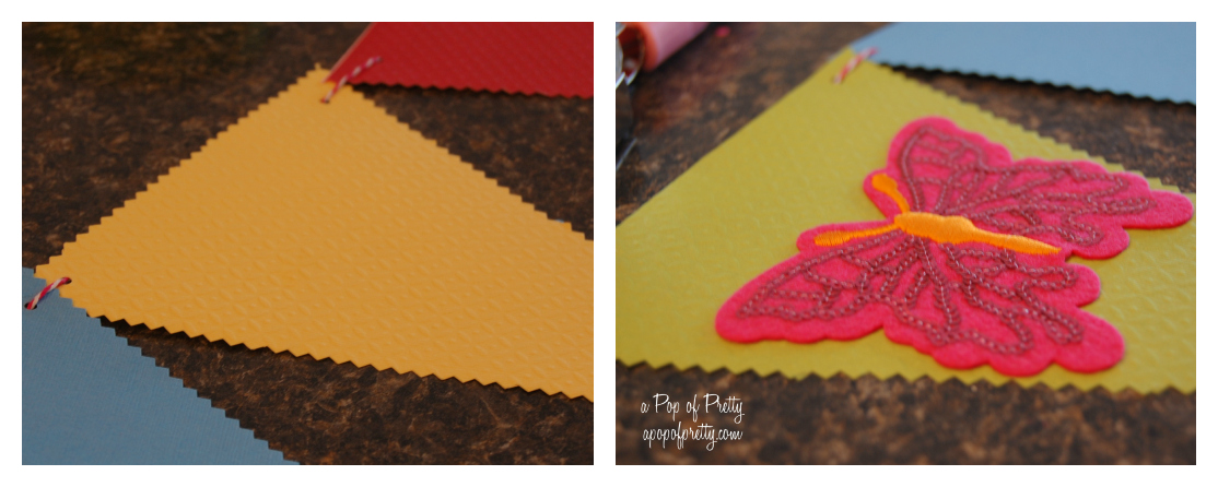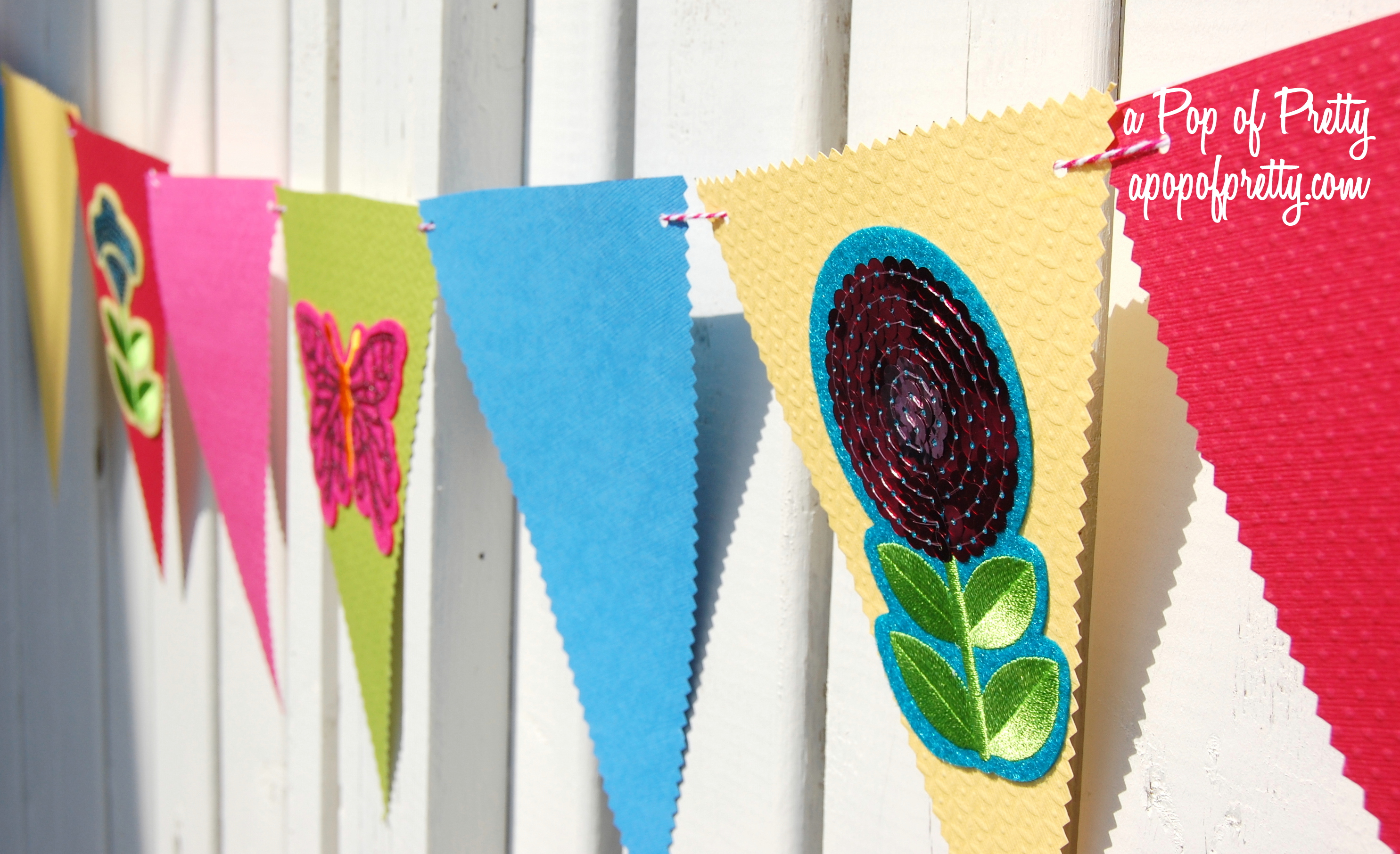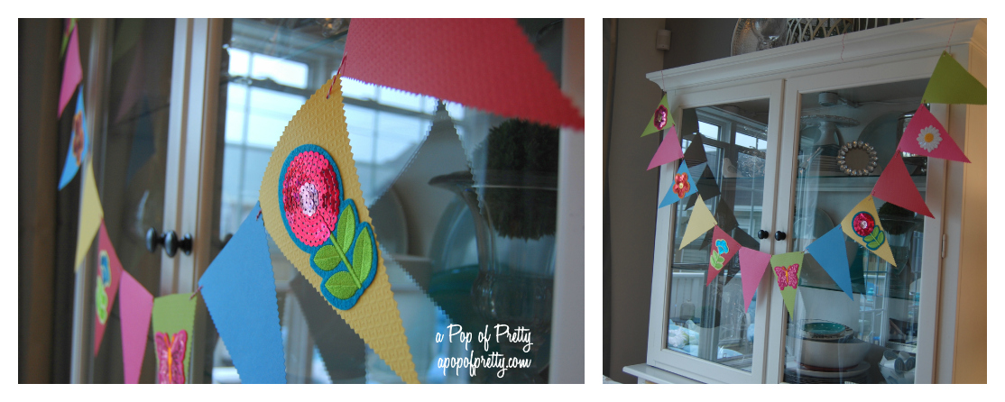 Next, run your twine or ribbon through the back or the first pennant. Keep adding pennants in this fashion until you have the length you want. I used 12 pennants on mine. Finally, add some pretty embellishments. I used some summery, self-adhesive felt/sequined shapes that I found for a steal. But anything that tickles your fancy, like die cut letters, would be great too.