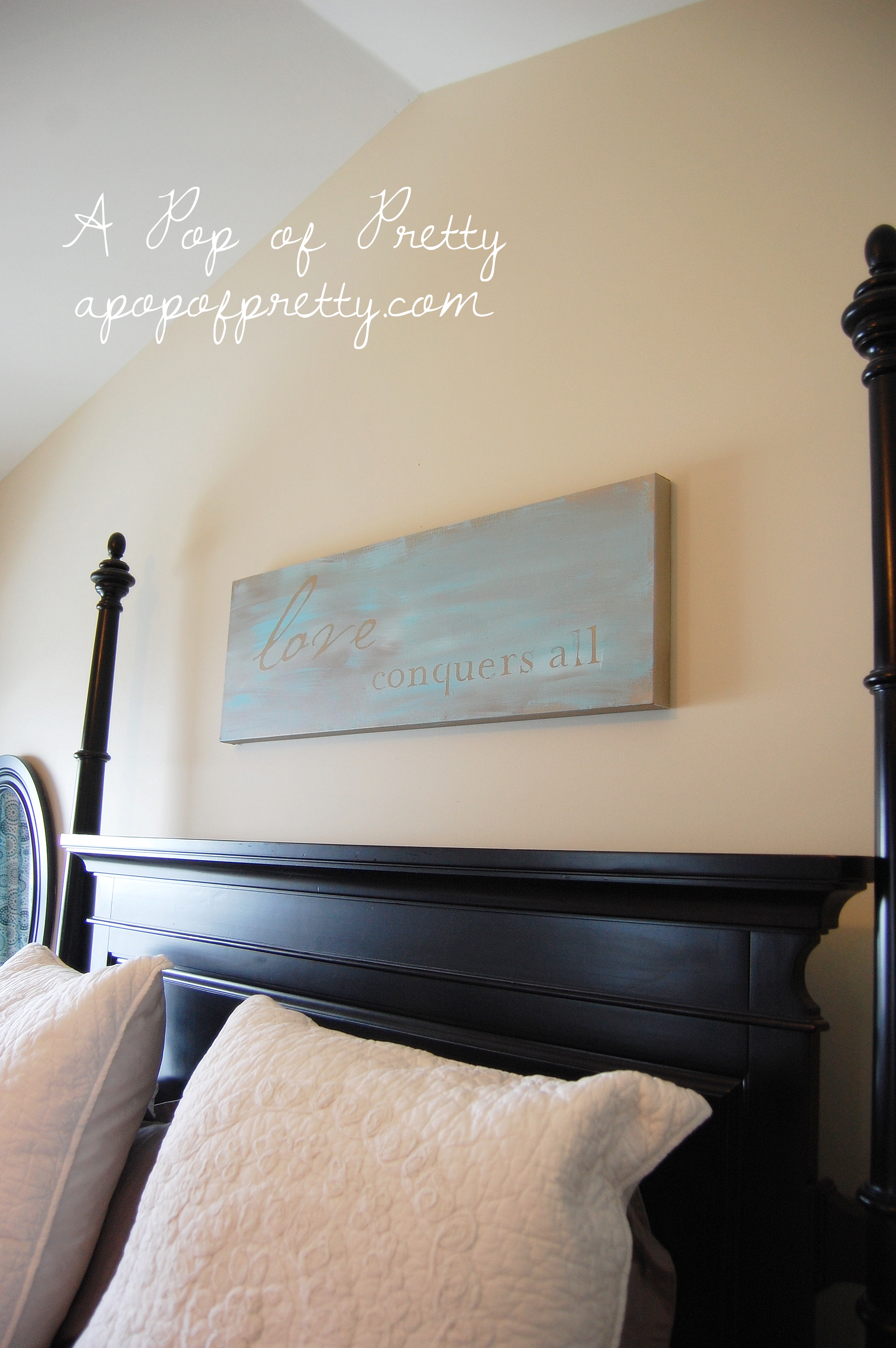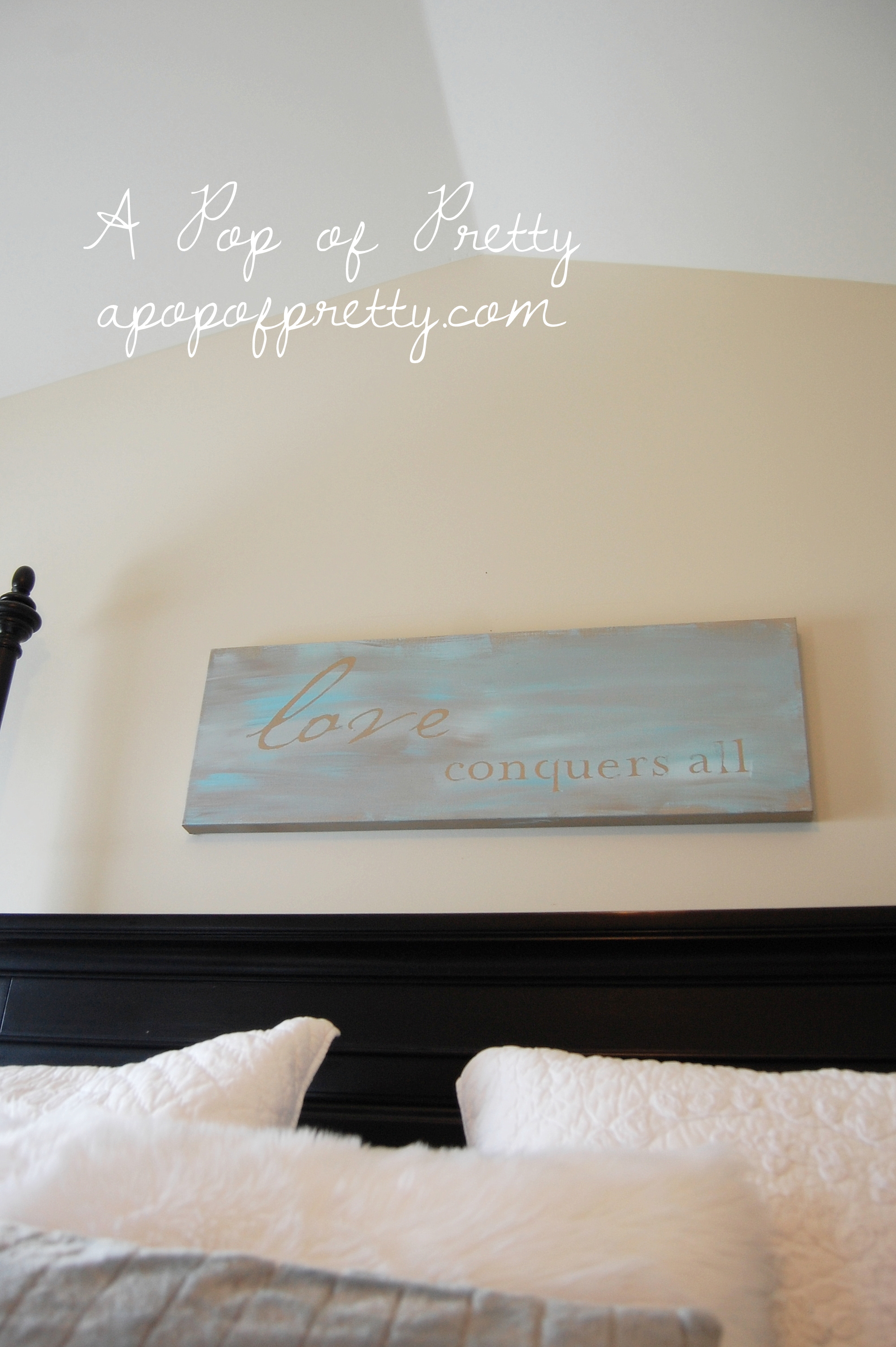 I had purchased a pre-cut black vinyl quote back in the fall that read “Love conquers all”. (That’s why, lol). I I got it for a low price, maybe at Homesense (under $10). I wasn’t sure what I was going to do with it at the time, but I knew it’d eventually become a project!