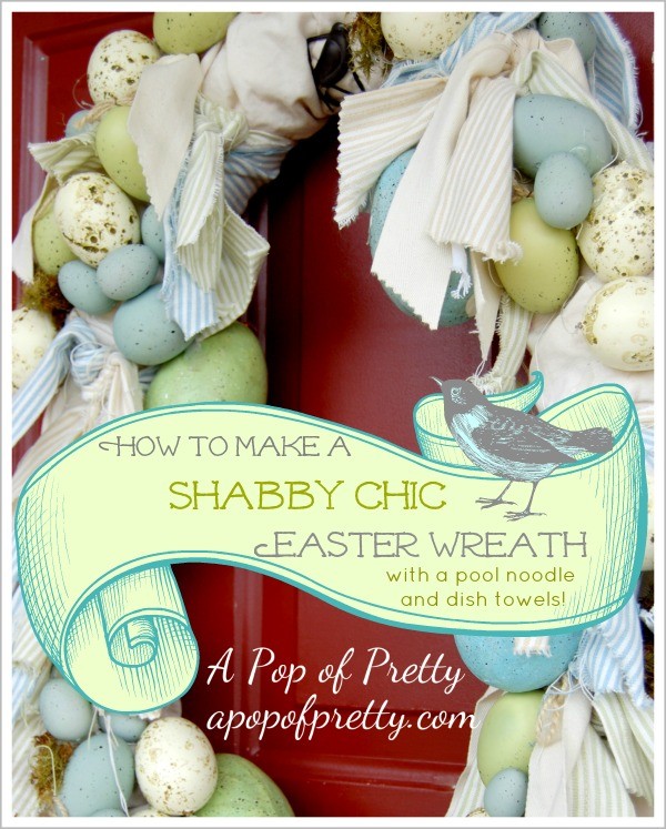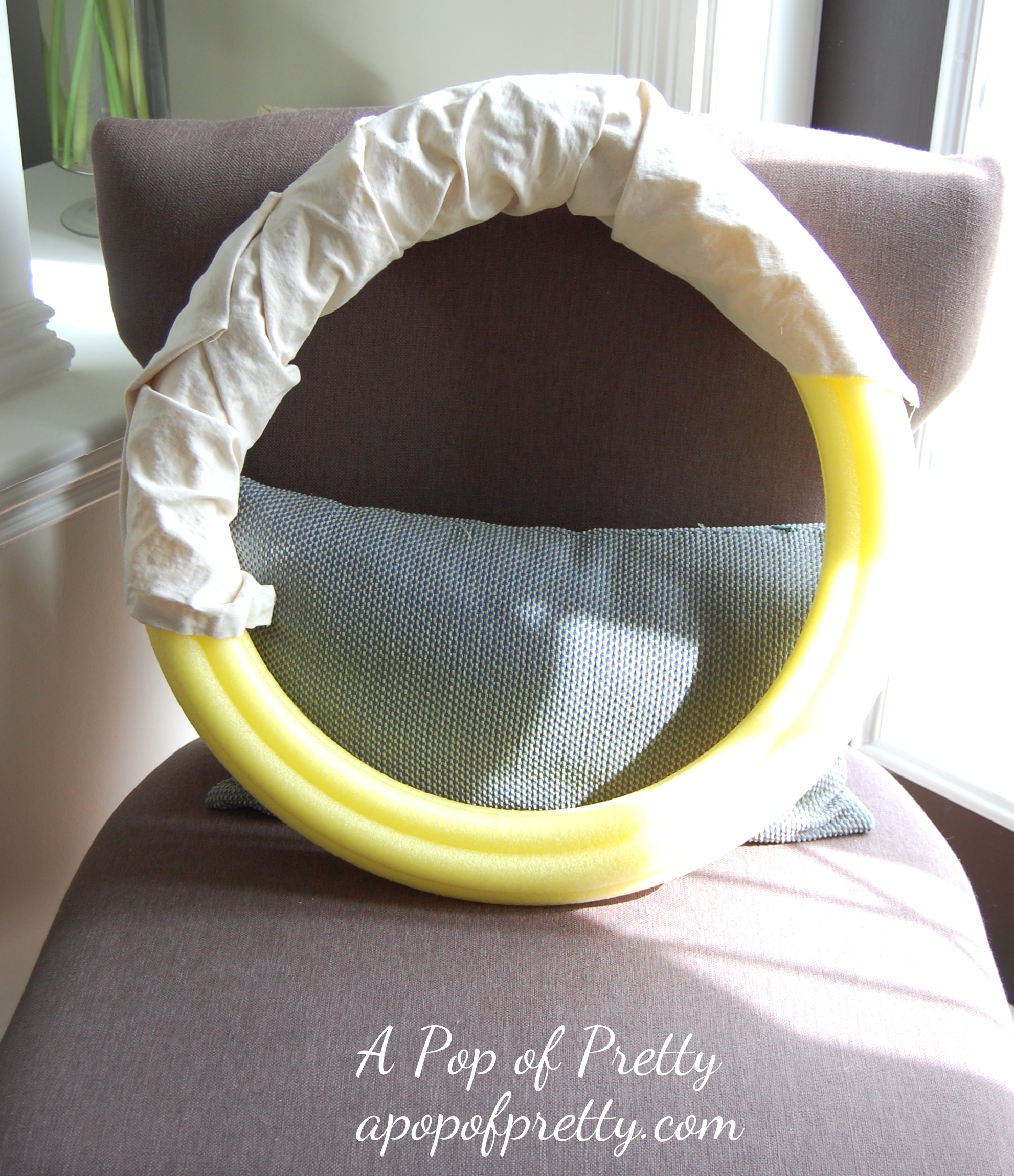 To get that ‘shabby chic’ look, I wrapped my ‘wreath form’ – actually a $2 pool noodle bent into an egg-shaped oval – with some washed/softened drop cloth. Yup, the very same stuff that you buy at the paint store…and the same stuff that’s been made famous by other decor bloggers who’ve made Pottery Barn-worthy sofa slip covers with it – truly amazing!
