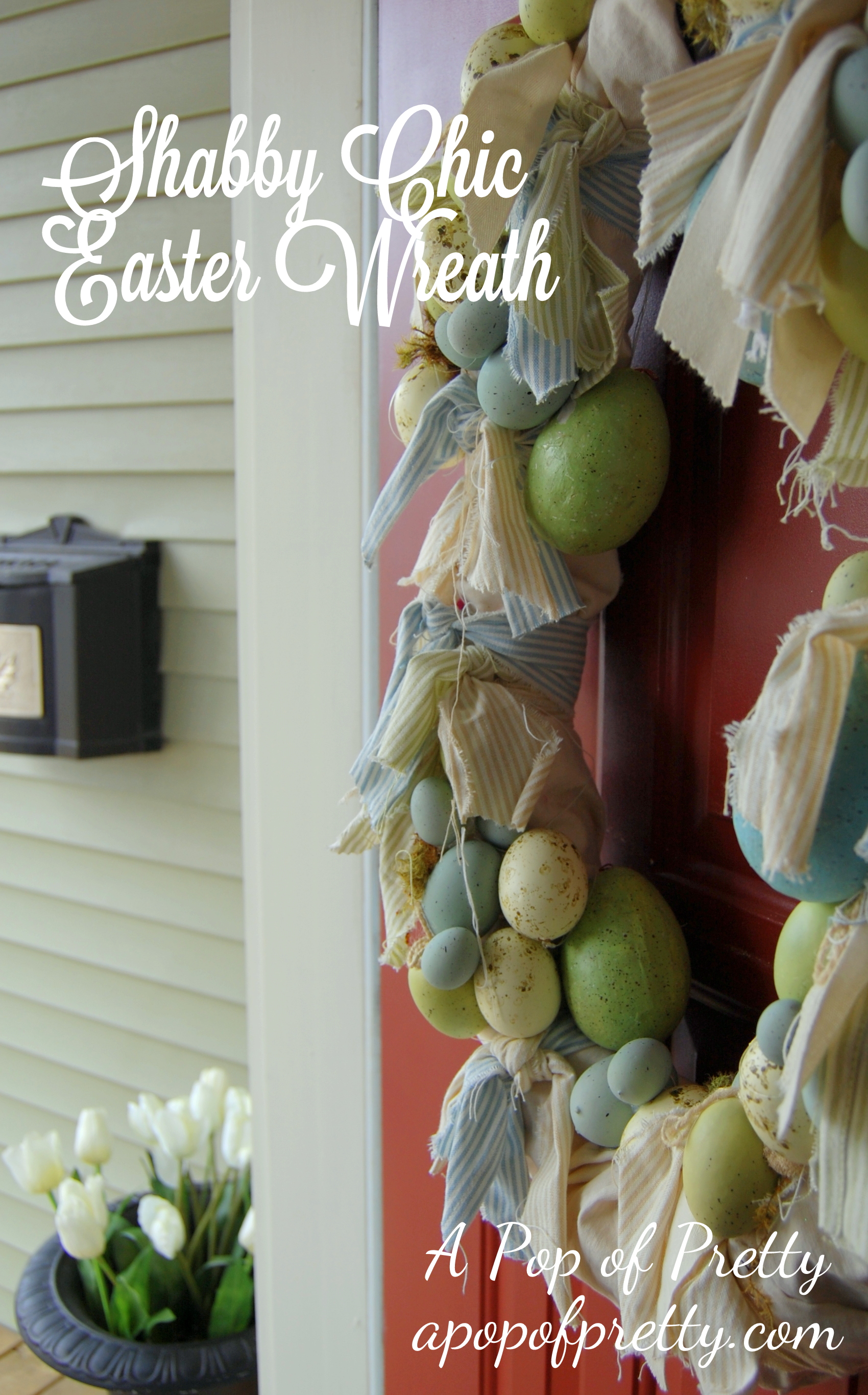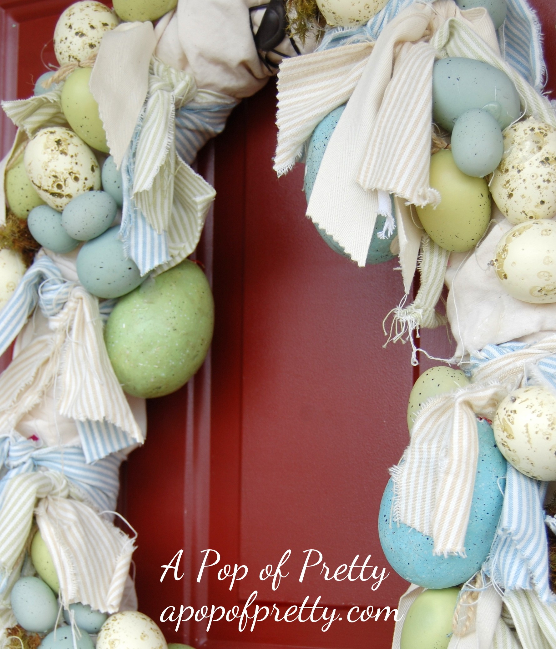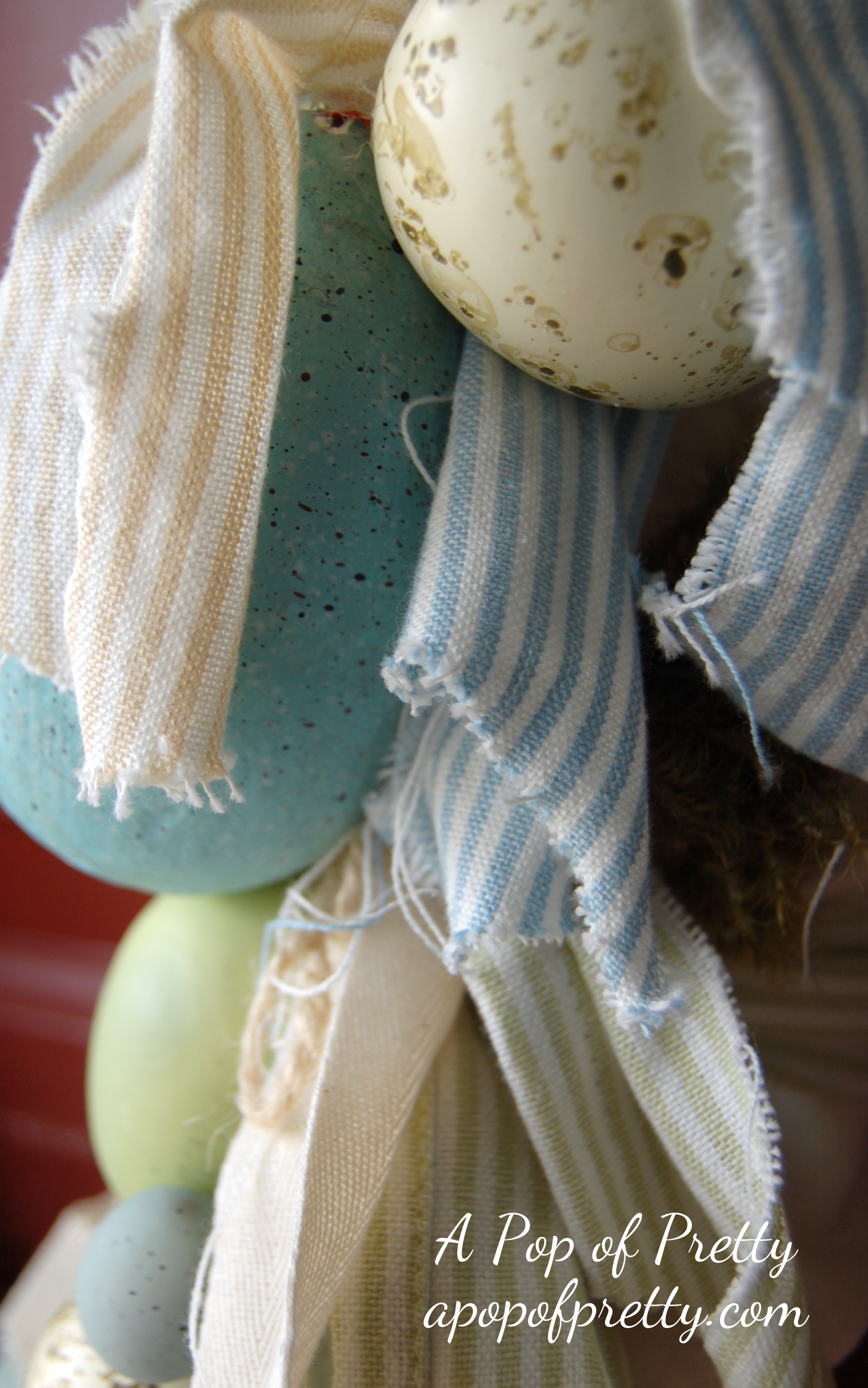 Next, I hand-tore a number of striped/ticking dish towels (un-used, just thought I’d add that in, lol) into strips so that they had tattered edges, and knotted the strips randomly around the wreath form. It was really that easy. I trimmed off the really shabby edges with pinking shears. I then glue-gunned on the freckled blue, green and cream Easter eggs, and I also added a bit of moss here and there.