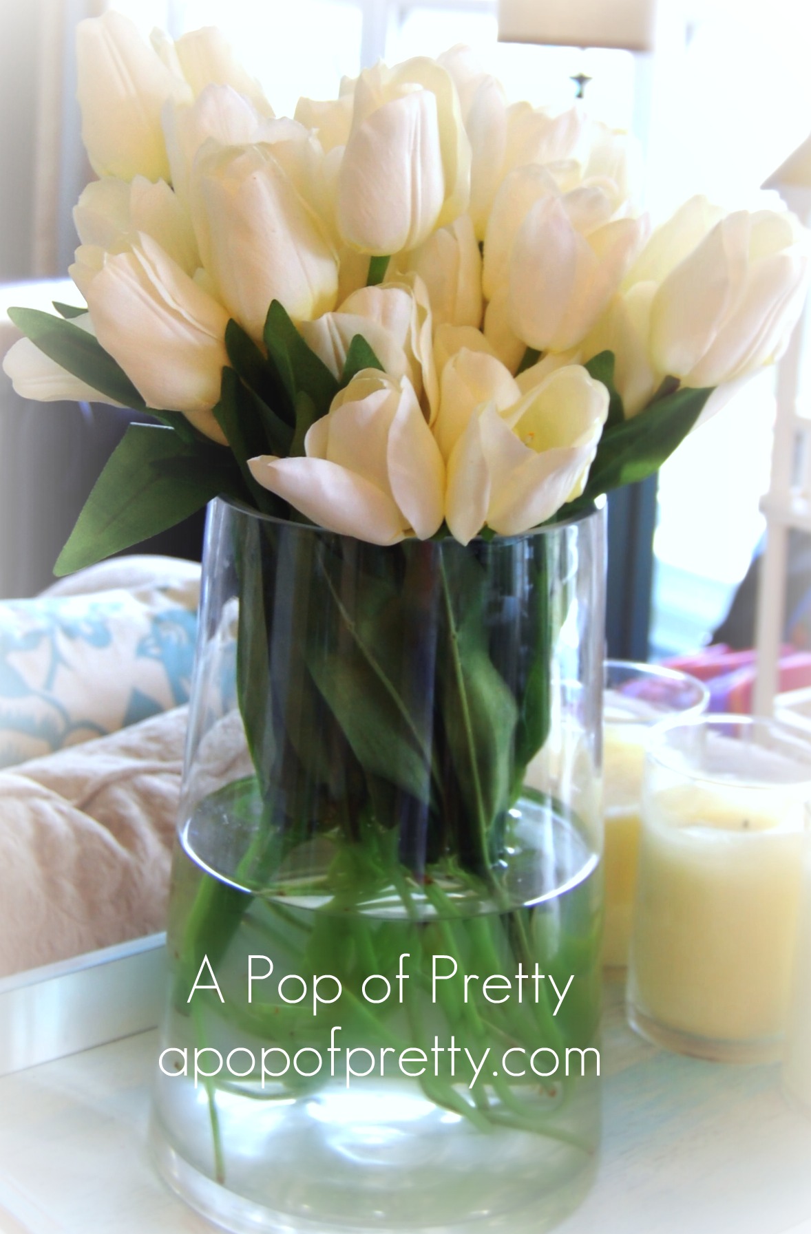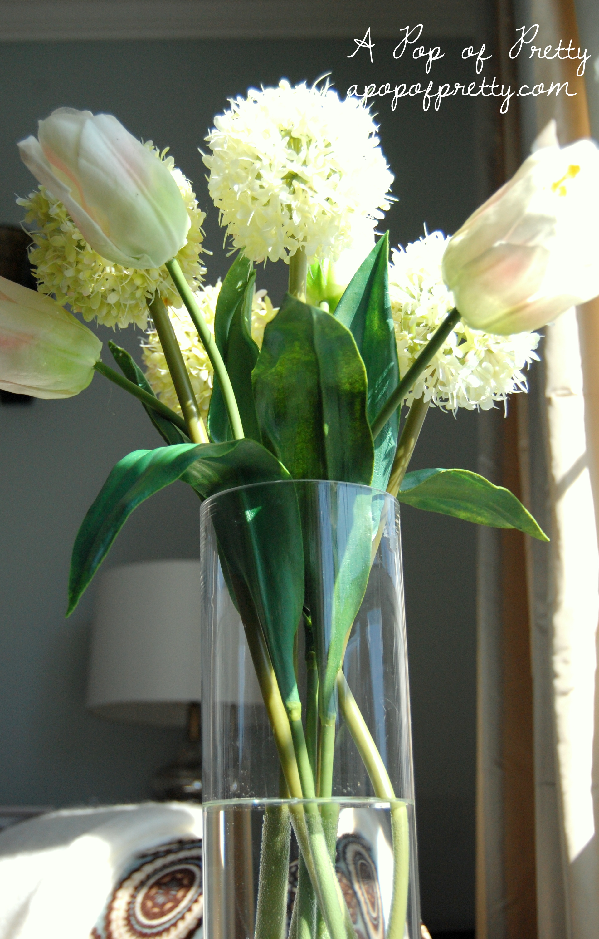 If your vase is glass, fill it with water, just like you’d do with natural flowers. This is a sure fire way to trick the eye into seeing a freshly-cut flower! Oh, and change the water regularly so it doesn’t look murky like it does in my vase at the right, lol.