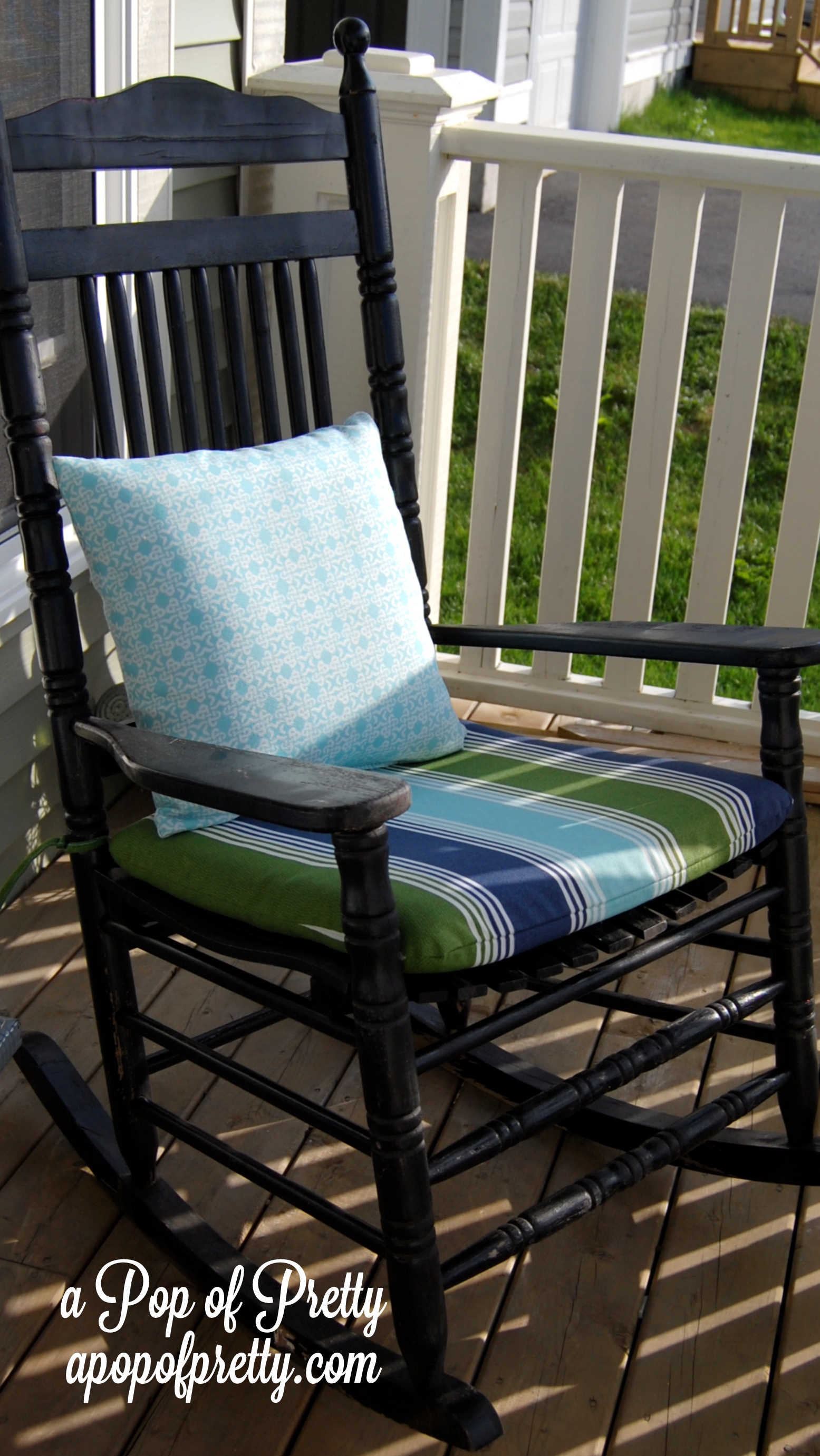 I even found some striped cushions for my rockers that incorporated both green and blue, which helped validate my color choice a little! Maybe I wasn’t off my rocker – excuse the pun – to pair a turquoise(ish) door with green siding, after all ;-).