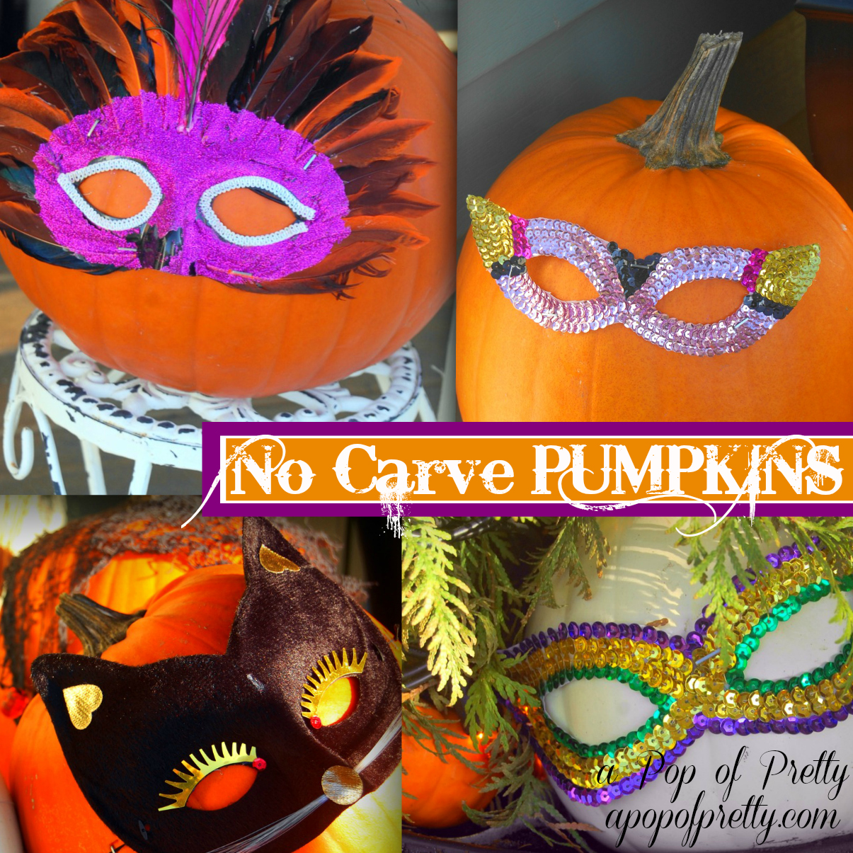 All you need to pull this off are pun-kins, a bunch of glittery masks from the dollar store (a buck fifty each) and a staple gun. What could be cheaper and easier, right? I thought about embellishing them a little more (there’s so many awesome inspiration photos on Pinterest), perhaps using thumbtacks for mouths and eyes, but in the end, mommy’s allotted Saturday ‘me time’ (i.e., decorating time) ran out and I kept it simple! I think their faceless-ness just adds to their mystique!