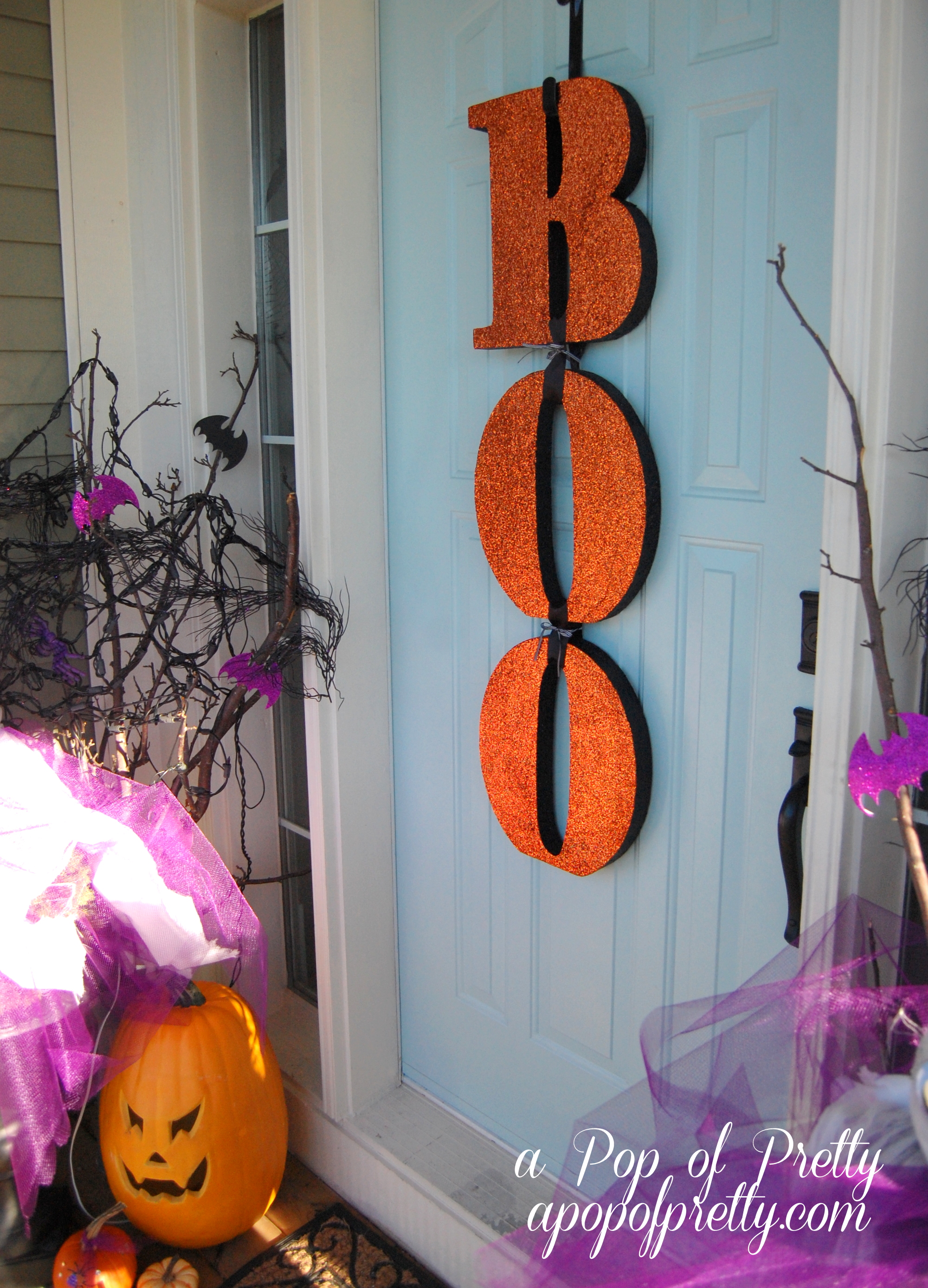 I fell for those giant, glittery BOO letters as soon as I saw them at our local Hallmark. The first time I spotted them, I thought, hmmmm, I could easily make those for a fraction of the price. All you’d need is styrofoam, orange paint and glitter. But in the end, I decided to make things easier on myself and buy them this time around . I think they were intended for a shelf or mantel, but I decided to tie them together with black ribbon and make a Halloween wreath with them instead.