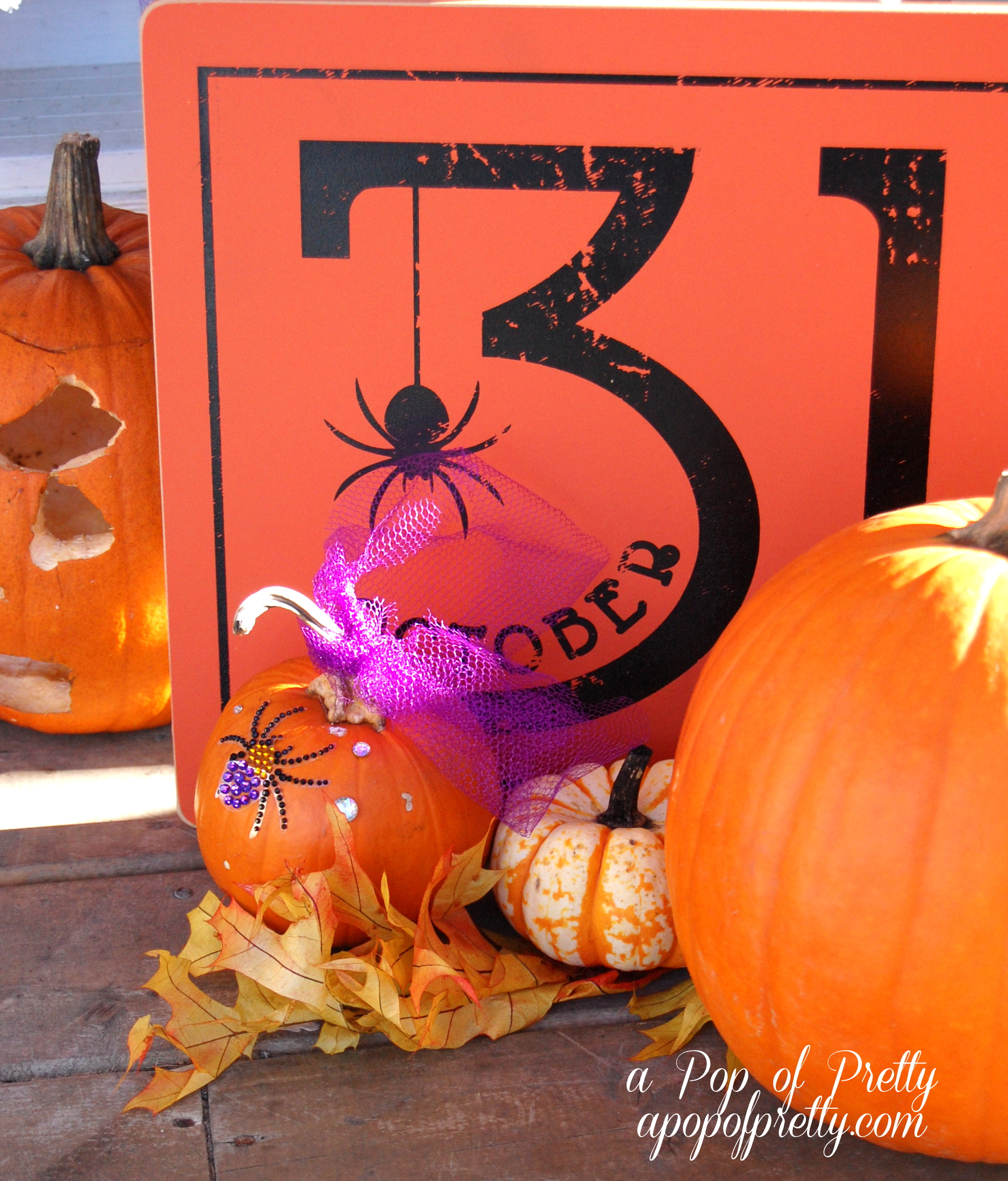 I decided to get in on the trend of embellished pumpkins, and added a little rhinestone spider and a purple bow to a couple of mini-pumpkins.