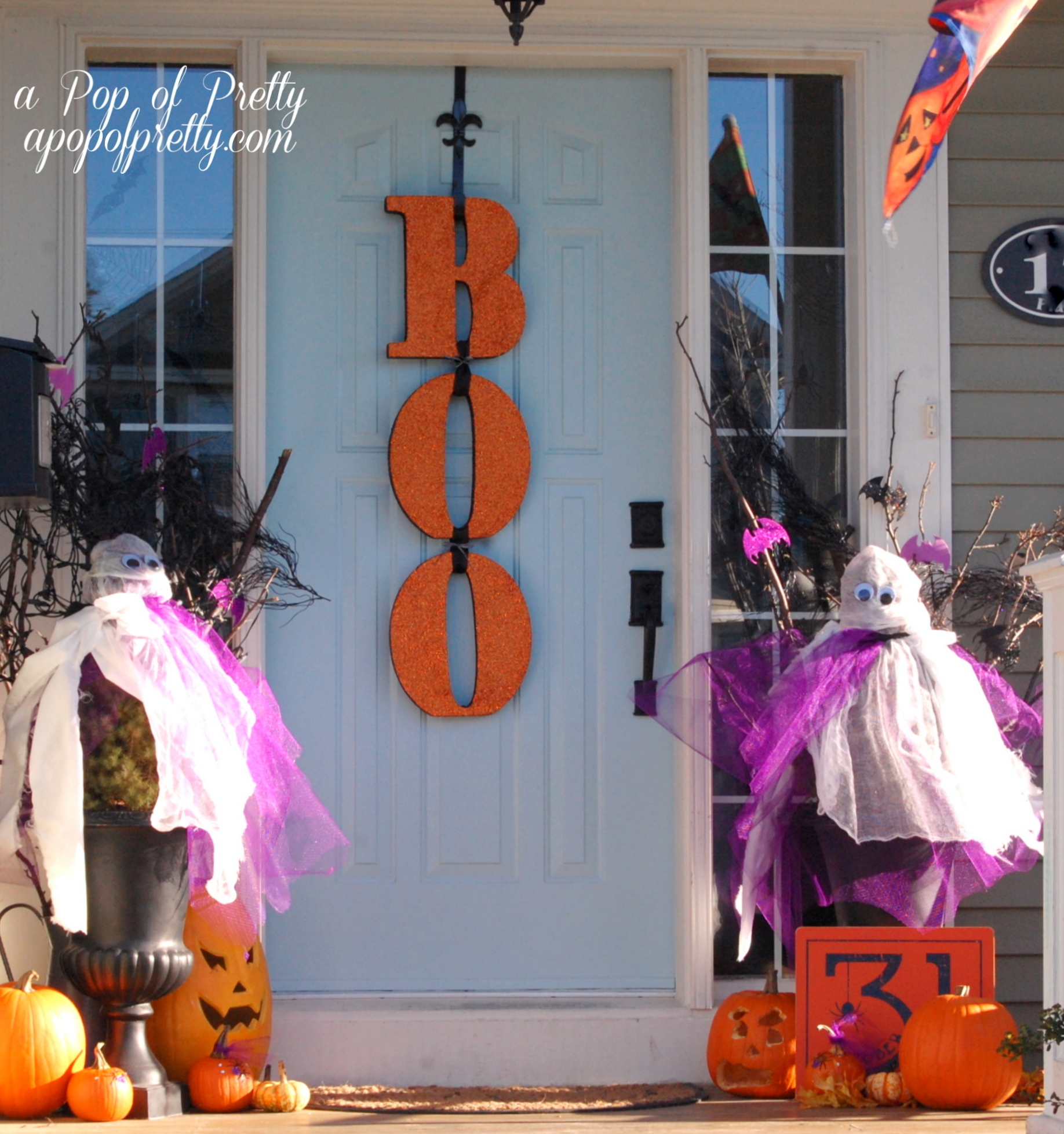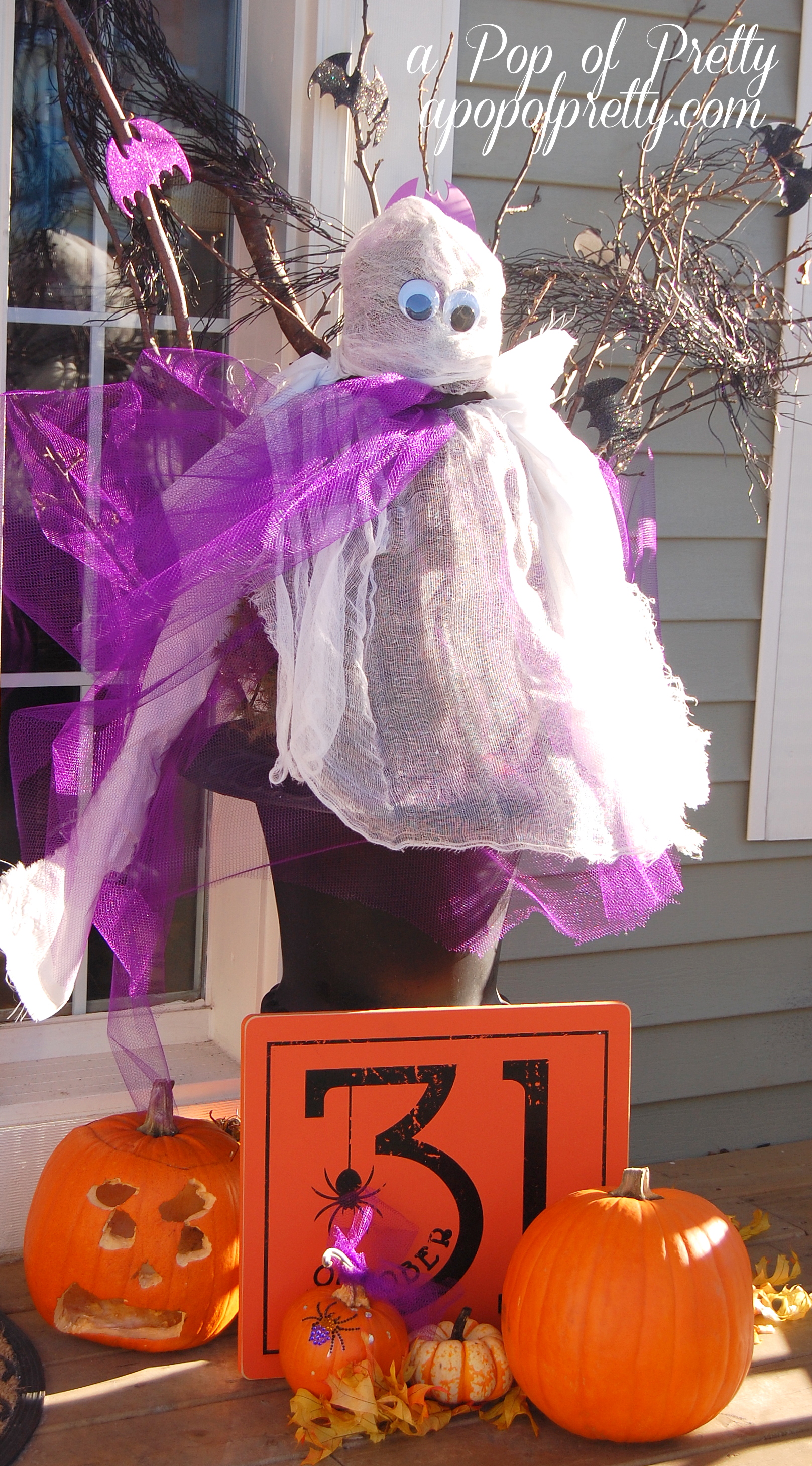 I created ghosts our of my spruce tree urns by layering cheesecloth and ripped white fabric on top of stiff bright purple mesh (the kind of fabric used to make dress crinolines) which helped to give them some fullness. To create the head, I simply wrapped a piece of string tightly around the top of the tree. They turned out a little creepier looking than I was expecting, so I glue-gunned on some big googly eyes to cute-ify them. (Apparently, I have a thing for googly eyes – last year, I created a bat-wreath with big googly eyes too!)