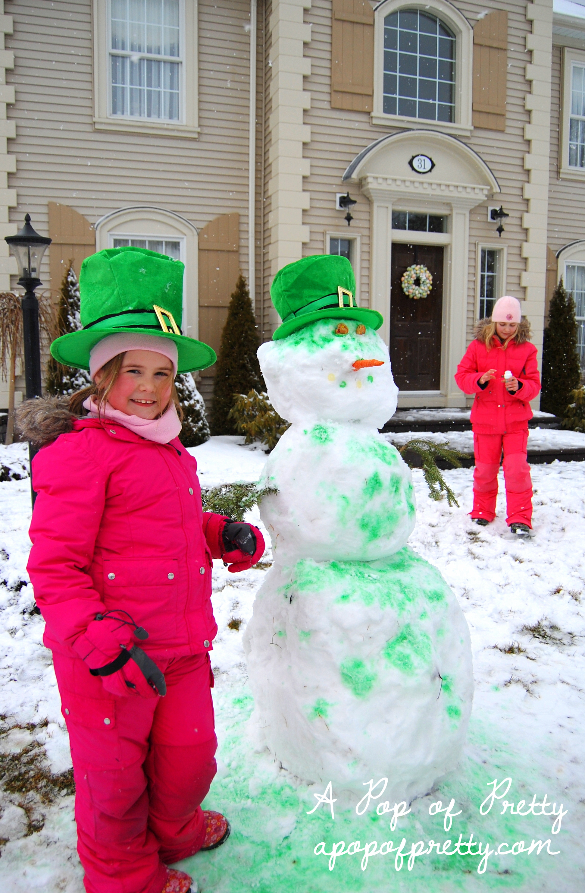The exterior of her home has signature Tuscan style trim and wooden shutters which you can get a sense of in this shot of our kids building a snowman for St. Paddy’s Day during a spring storm.