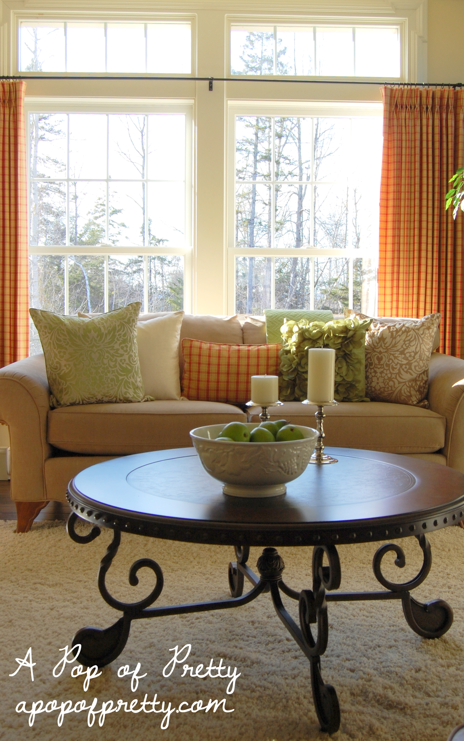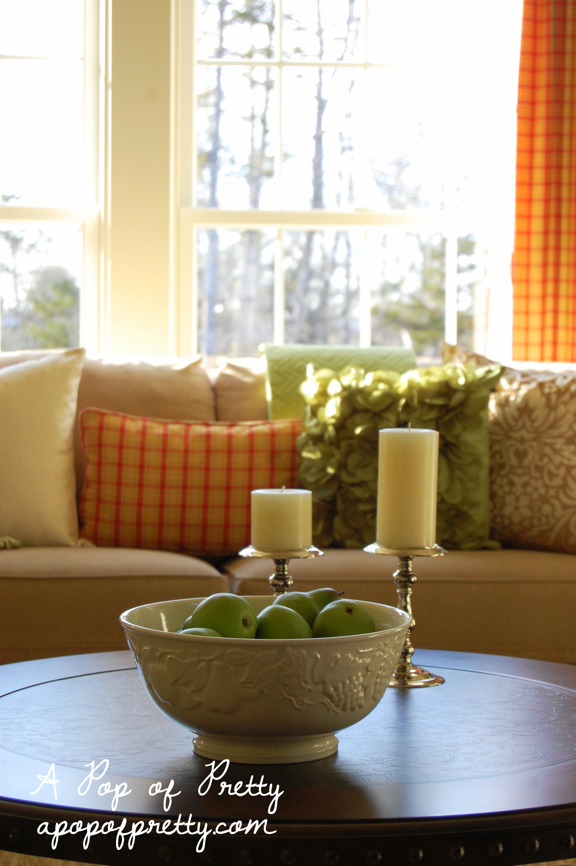 I’m absolutely in love with the color scheme in her family room: red, creamy taupe and apple green….
