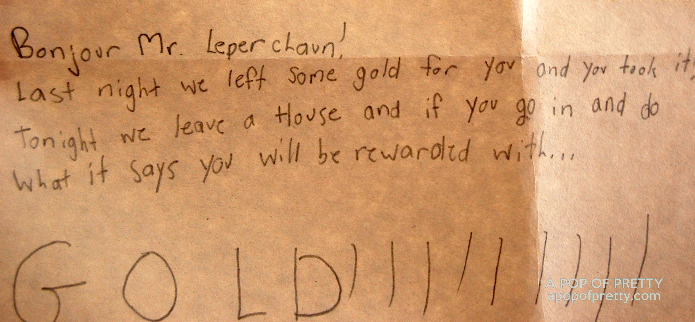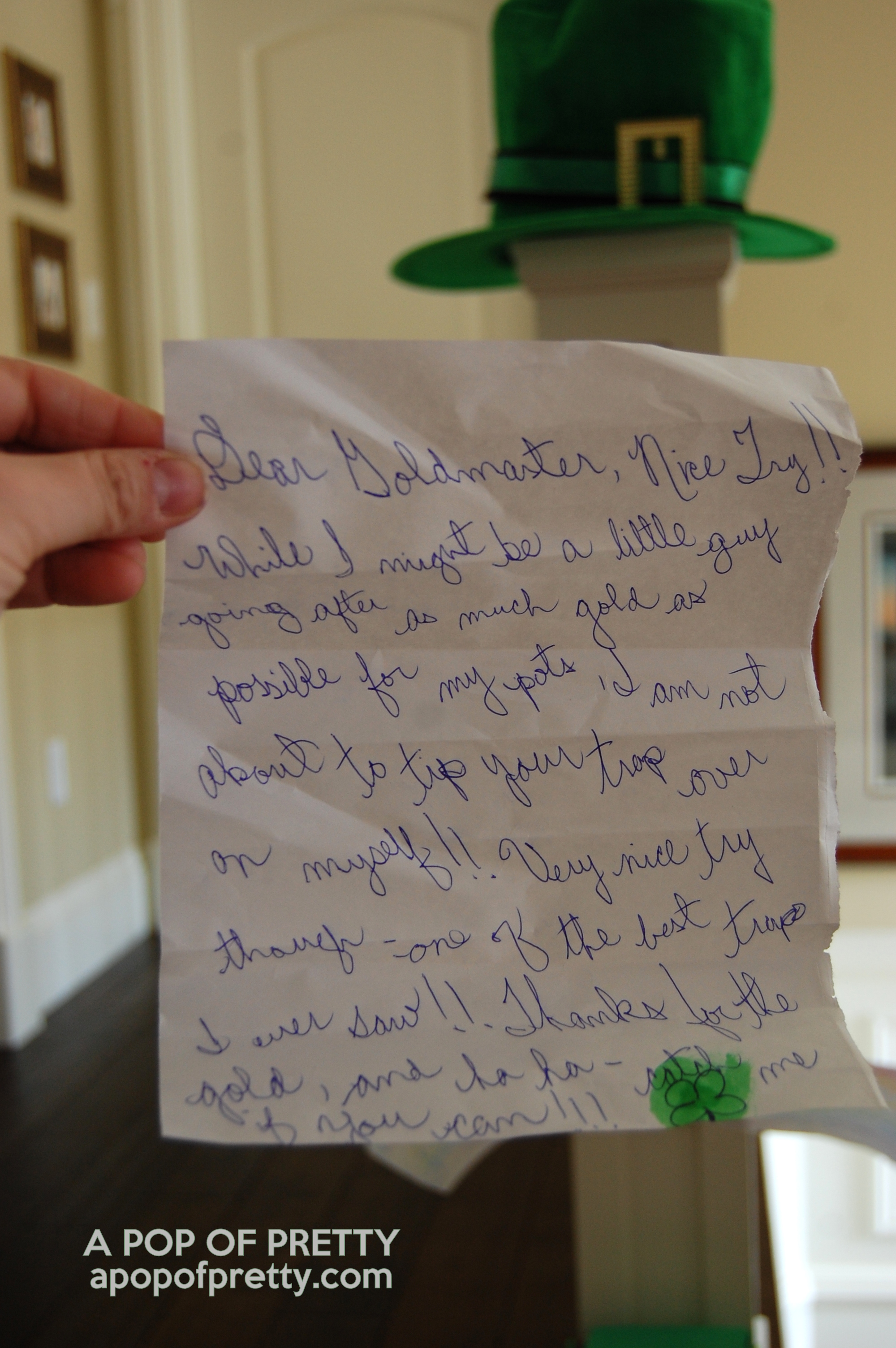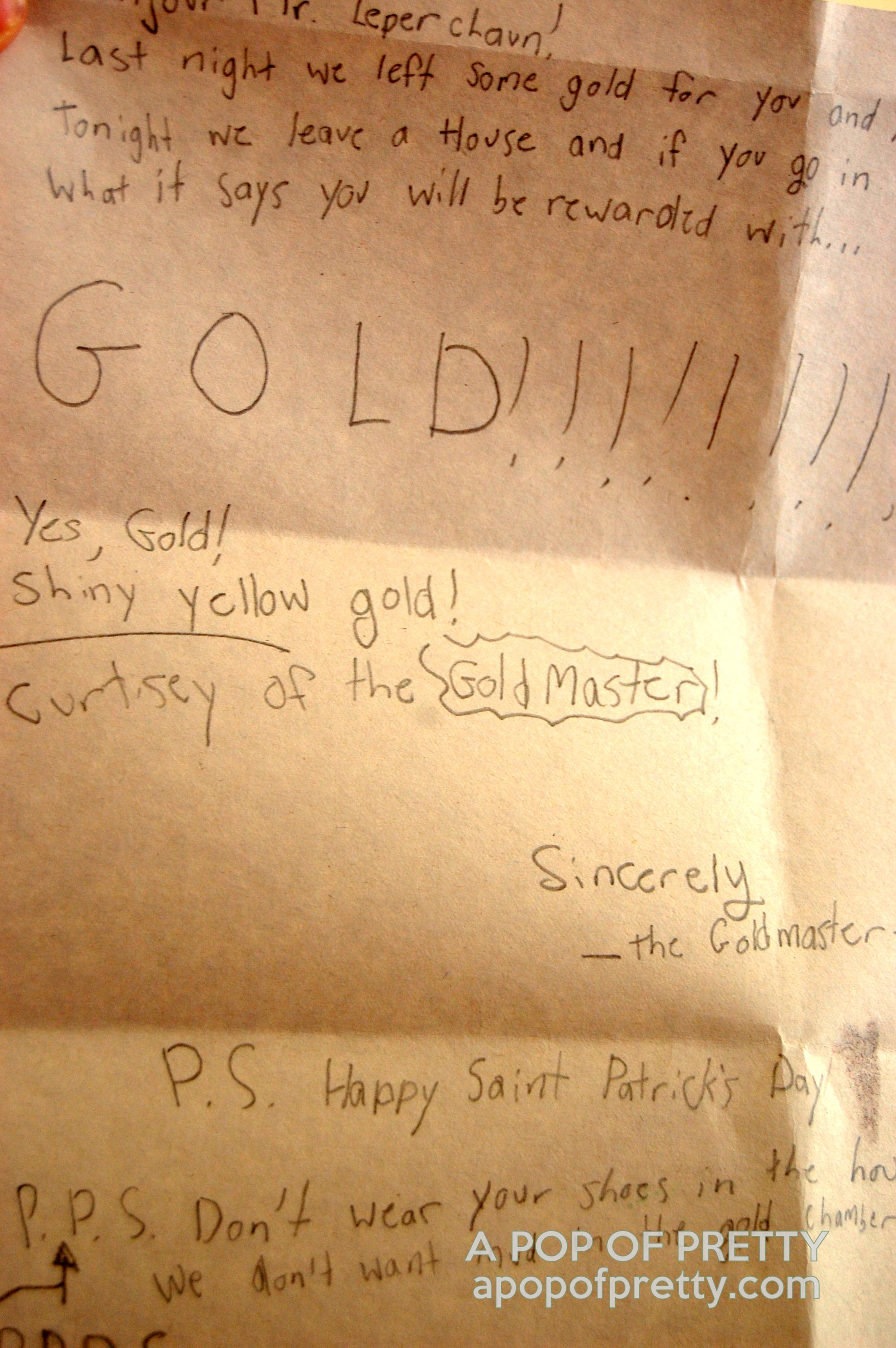 You’ll note that at the end of the letter, Miss G and her cousins requested that he please not wear his shoes in the leprechaun house. LOL. Those kids are well-trained!