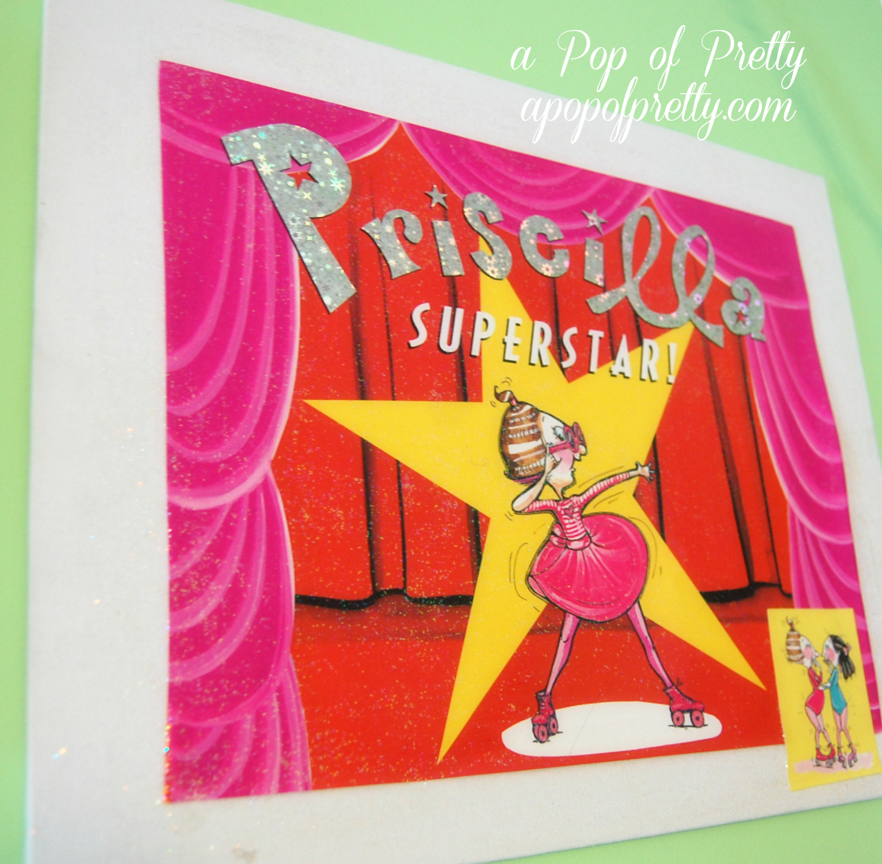 It was so simple. I just mod-podged the jackets of her favorite hard cover books to boards. I also pulled out some inspiring excerpts from her favorite books, and re-created them on my computer. Then I used sparkly Mod Podge to adhere the pages to 8×10 canvases.
