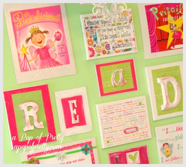 I also used Mod Podge to create this ‘READ’ gallery wall for my daughter’s bedroom a couple of years ago. (You can click the link for the original post.)