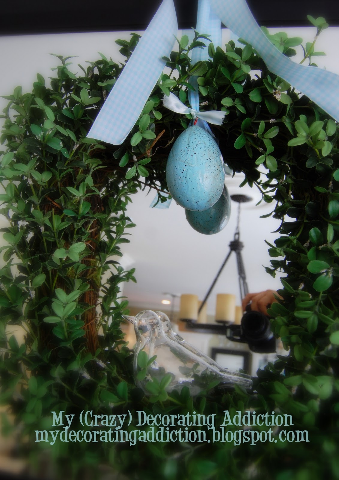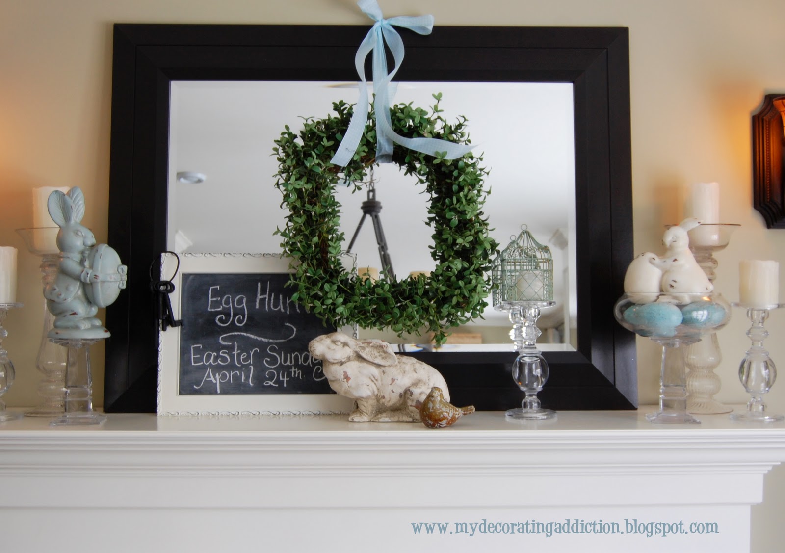 Your mantel looks great and I love the Easter eggs on the chandelier and on the wreath!