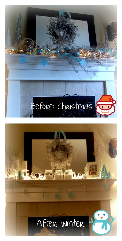 I think your winter mantel looks beautiful. Great transition.