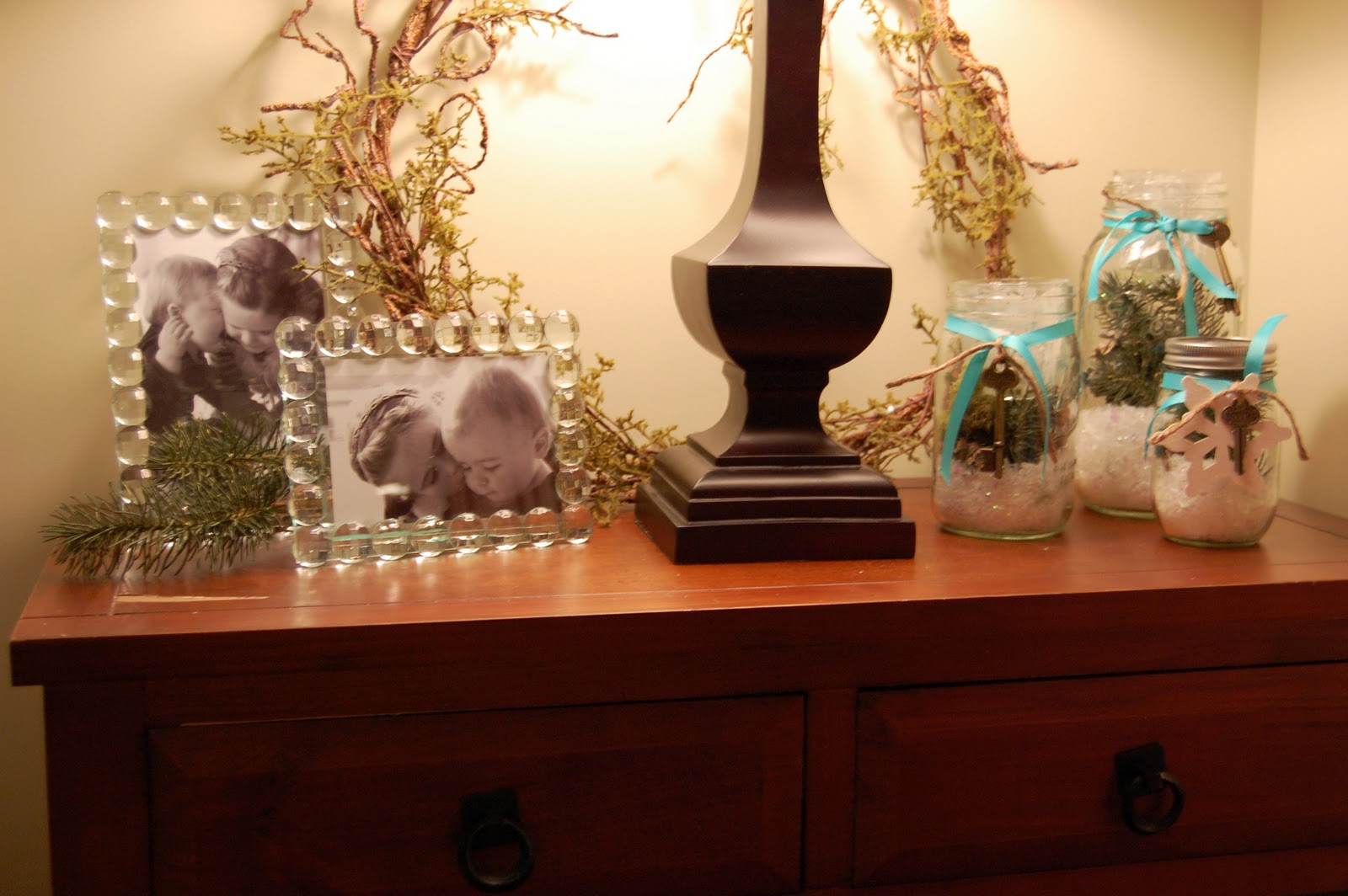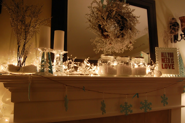 What a great transition from Christmas to Winter! The simple jars filled with faux snow and lights behind just "make" it! The touch of teal is unexpected and pleasing!