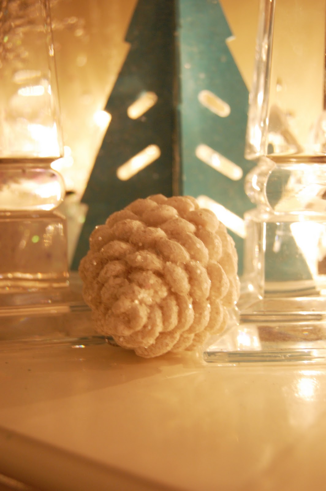 Finally, for visual interest, I added in a bit more colour with the turquoise trees that were part of my Christmas stash, and texure with the white pine cones. In addition, I pulled in the DIY snowflake garland that I had made for my master bedroom during the Christmas season.