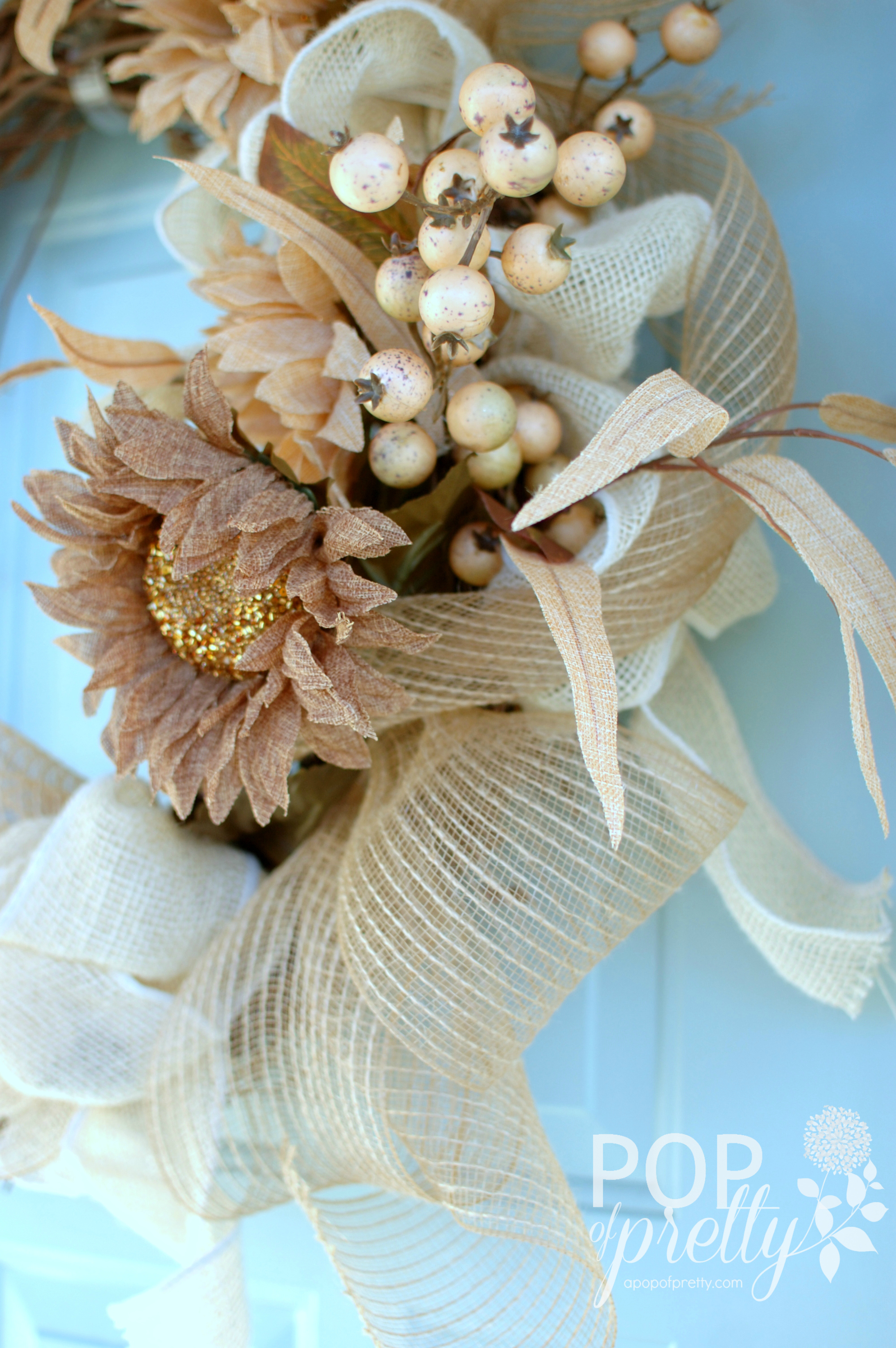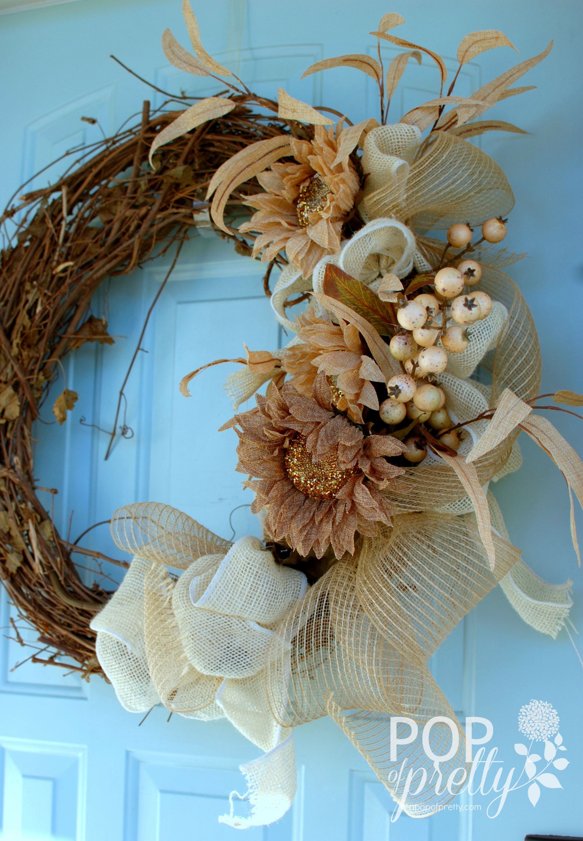 It lacks all that traditional Fall color, but makes up for it in natural texture from the grapevine, dried leaves, and a variety of burlap ribbons. The glittery sunflowers add a bit of fun.
