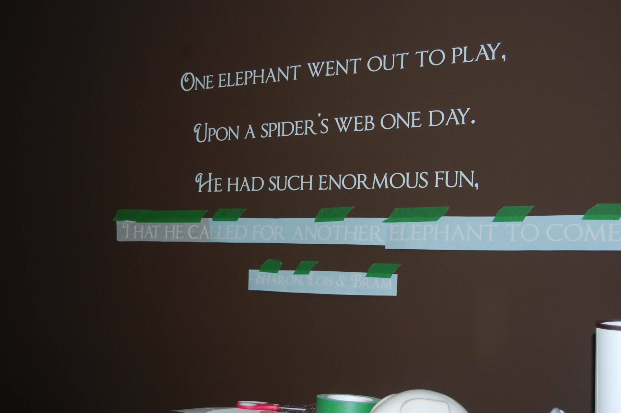 The large wall quote (below) is the main decor feature of the room. It’s custom-cut vinyl, based on a verse in a song by a Canadian children’s music trio: Sharon, Lois and Bram. I thought it was cute for twins, especially since I had committed to the mod elephant ‘theme’. It goes: One elephant went out to play, along a spider’s web one day. He had such enormous fun, that he called for another elephant to come!”