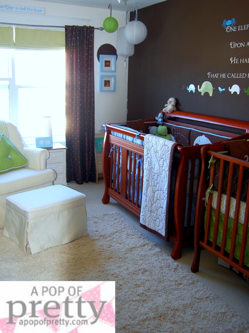 I chose a ‘mod’ elephant theme, rather than a more cutesy jungle look, because I figured it could stick around past the baby stage. Plus, I still really love the brown-blue-green color scheme, so I won’t be changing that part. But I’ve gotta figure out how to fit two twin beds in the space! It was pretty easy to fit two cribs against the long wall, end to end. But it’s going to be a challenge to figure out how to make this room function in a different configuration.