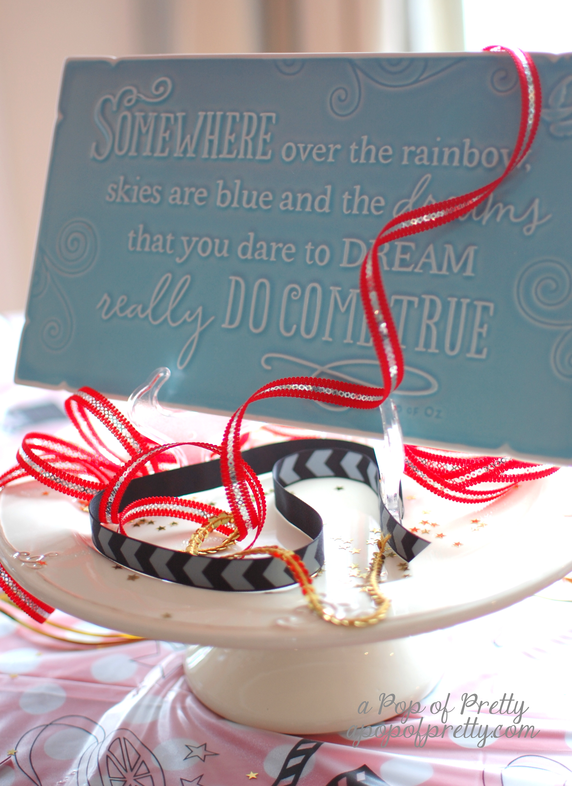Another way to infuse Broadway throughout your party decor is to print our the lyrics of favourite musicals. For example, for our table centerpieces, I used two ceramic plaques we had purchased earlier this year from the Wizard of Oz collection at Hallmark. However, you could just as easily print out your Broadway quotes or lyrics, and adhere them to card stock or wood.