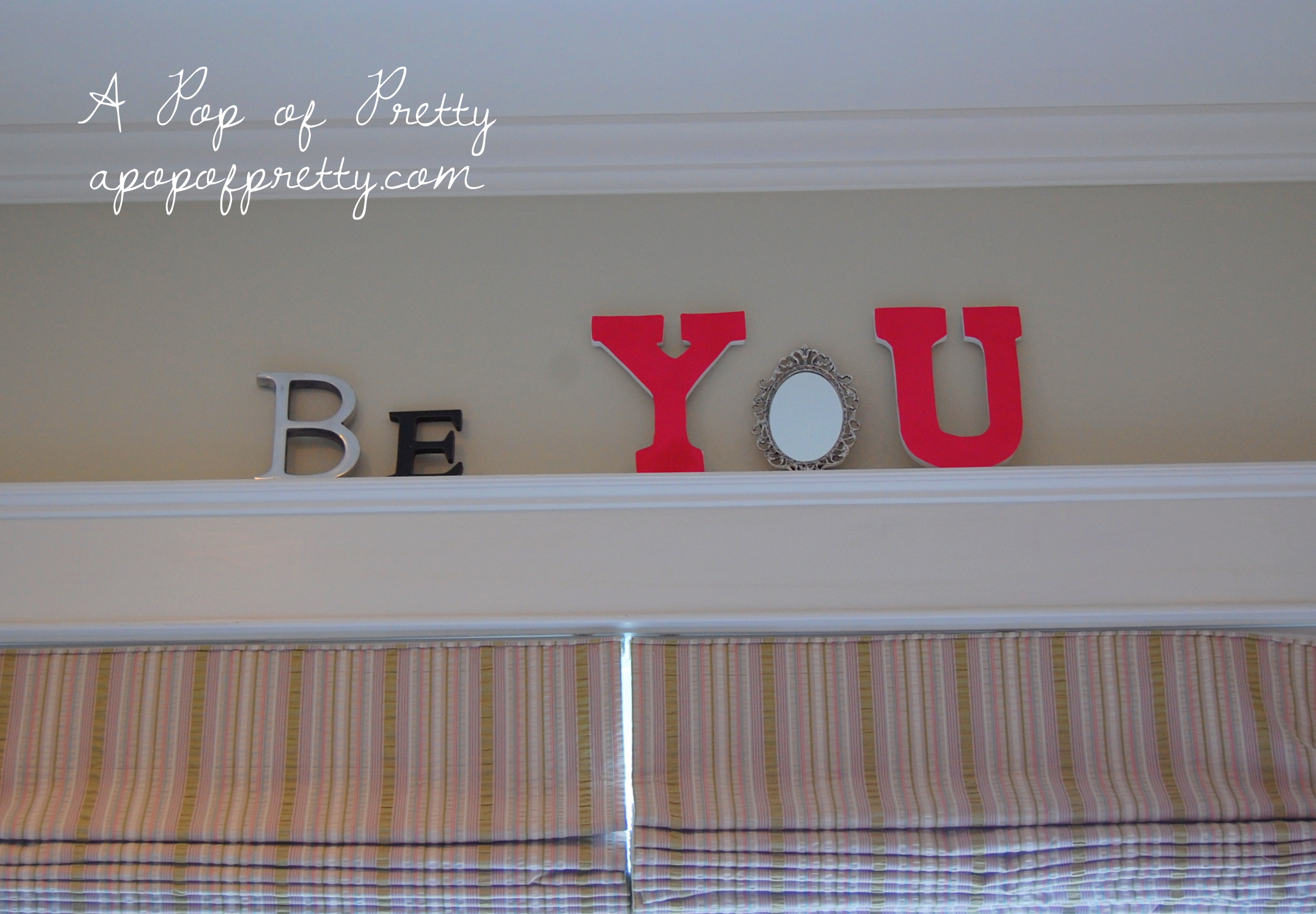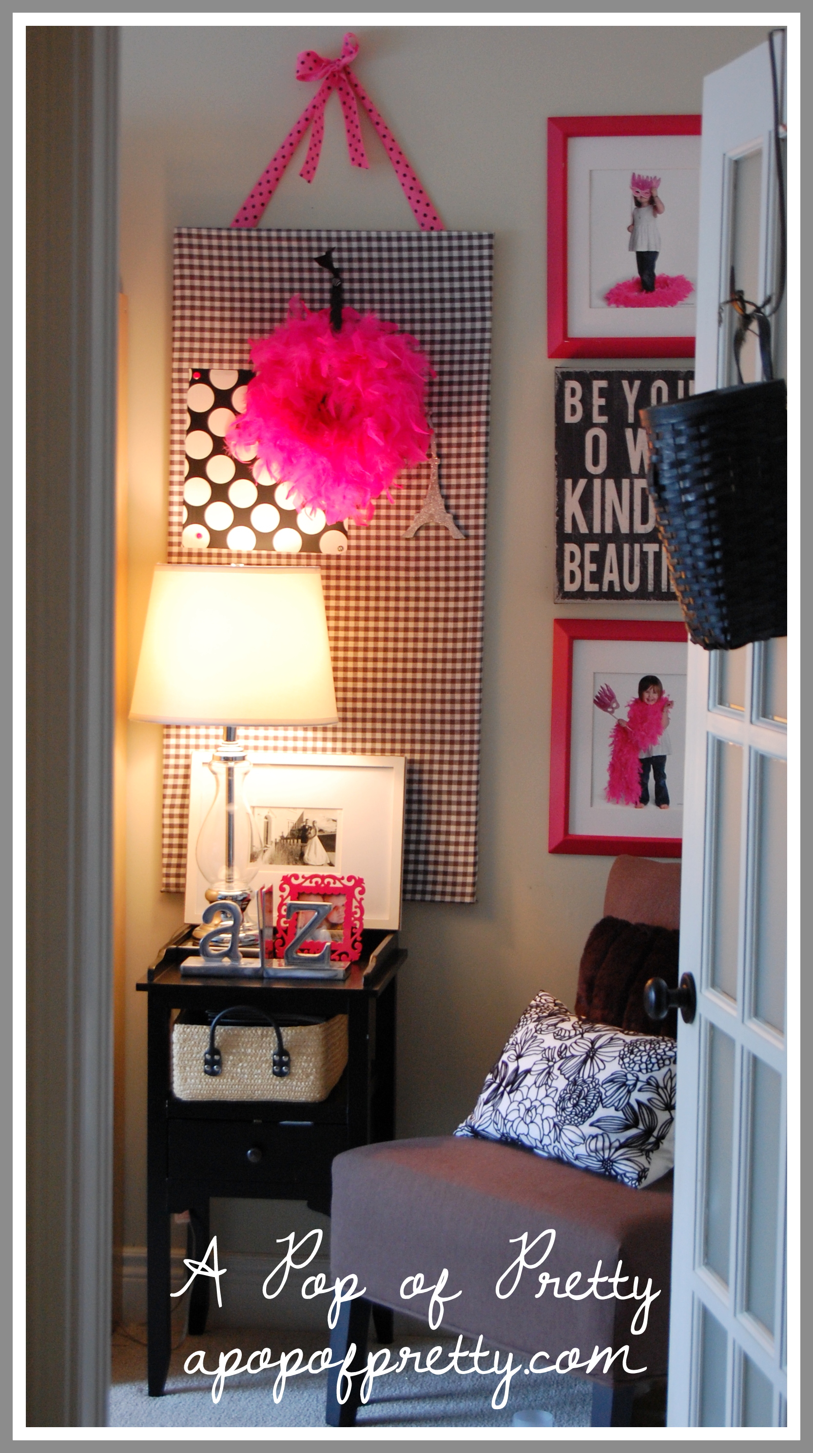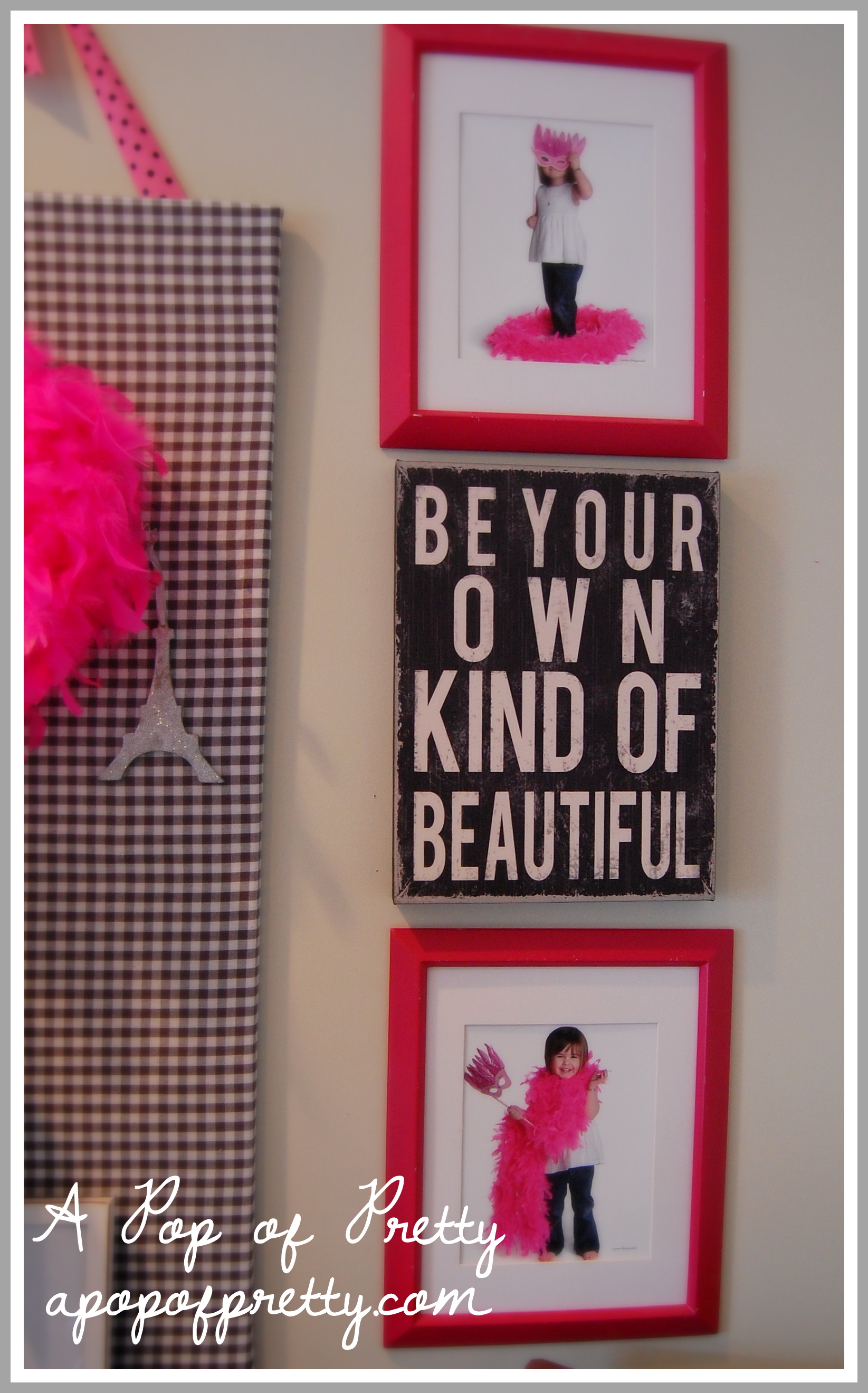 On one of the walls, I used portraits of my daughter that we had taken back when she was just 3, playing with a pink boa. I found this fitting word art ,”Be your own kind of beautiful” at HomeSense.