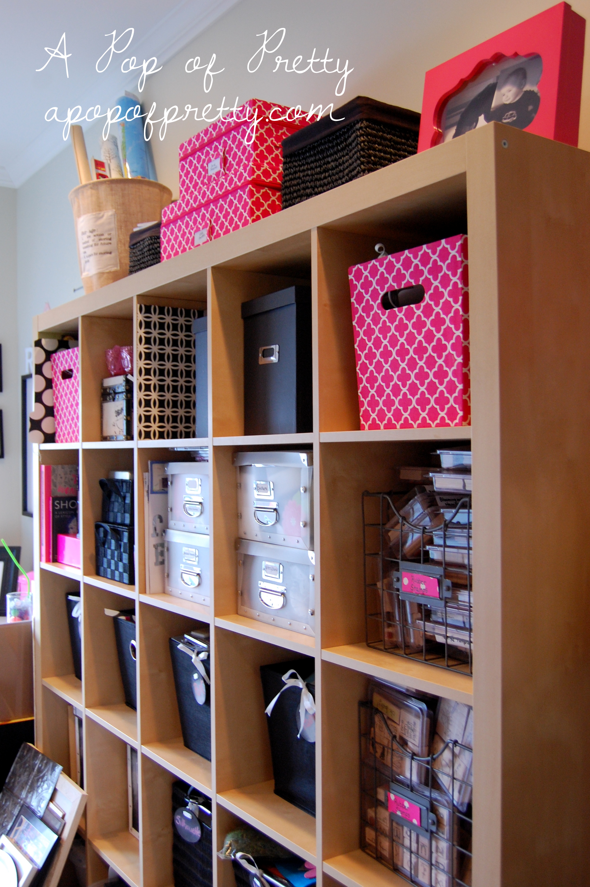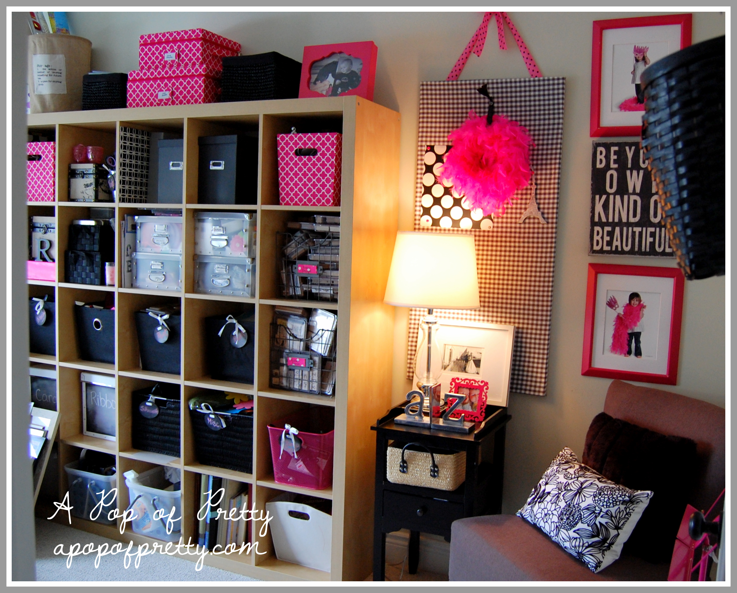 The storage unit is the ever-popular Expedit from IKEA. I love how it stores ALL of my craft stuff (no small task, lol). (We also have the Expedit storage system in our downstairs playroom, and it’s been a life-saver at keeping things semi organized around here!) The pink and black baskets and bins were collected over time. Whenever I saw one that matched the room, I snatched it up. I think I’ve finally traded out all of the old mismatched ones.