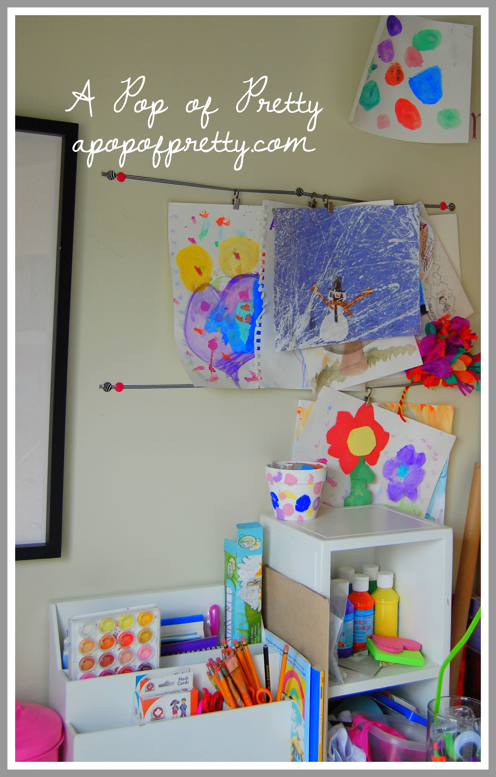 My daughter also uses the craft desk, so I added a little area on the wall to hang her masterpieces. It was so simple. I just attached thin ribbon to the wall with pretty tumb-tacks. The little hooks that hang the art are from IKEA, but you could easily use hinged paper clips (bull clips).