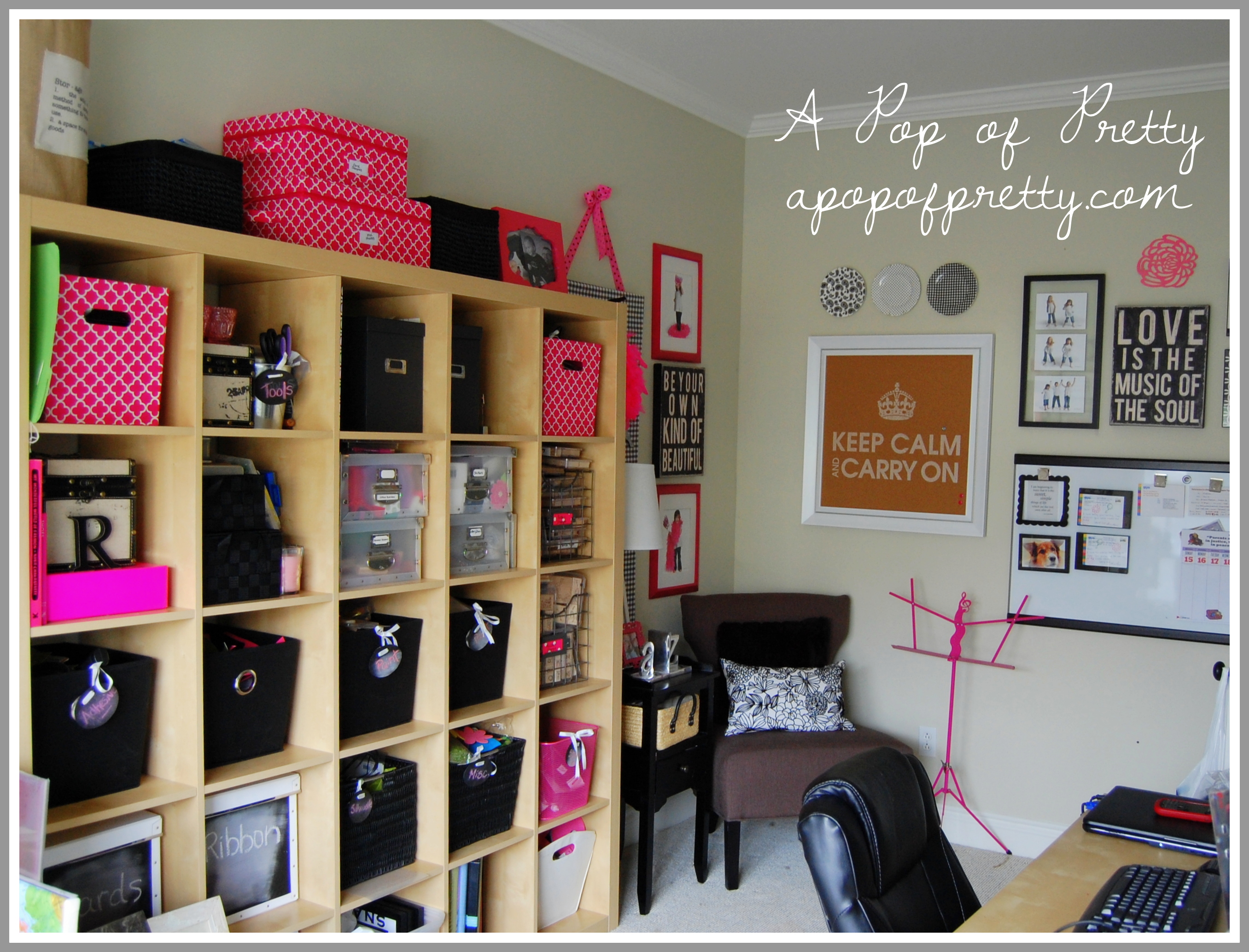 Over the past few weeks, I’ve been organizing and finessing my (pink and black) craft room / office. Those of you who have been following along here for awhile might remember that last summer I was finally able to carve out some space of my own where I could work and craft.