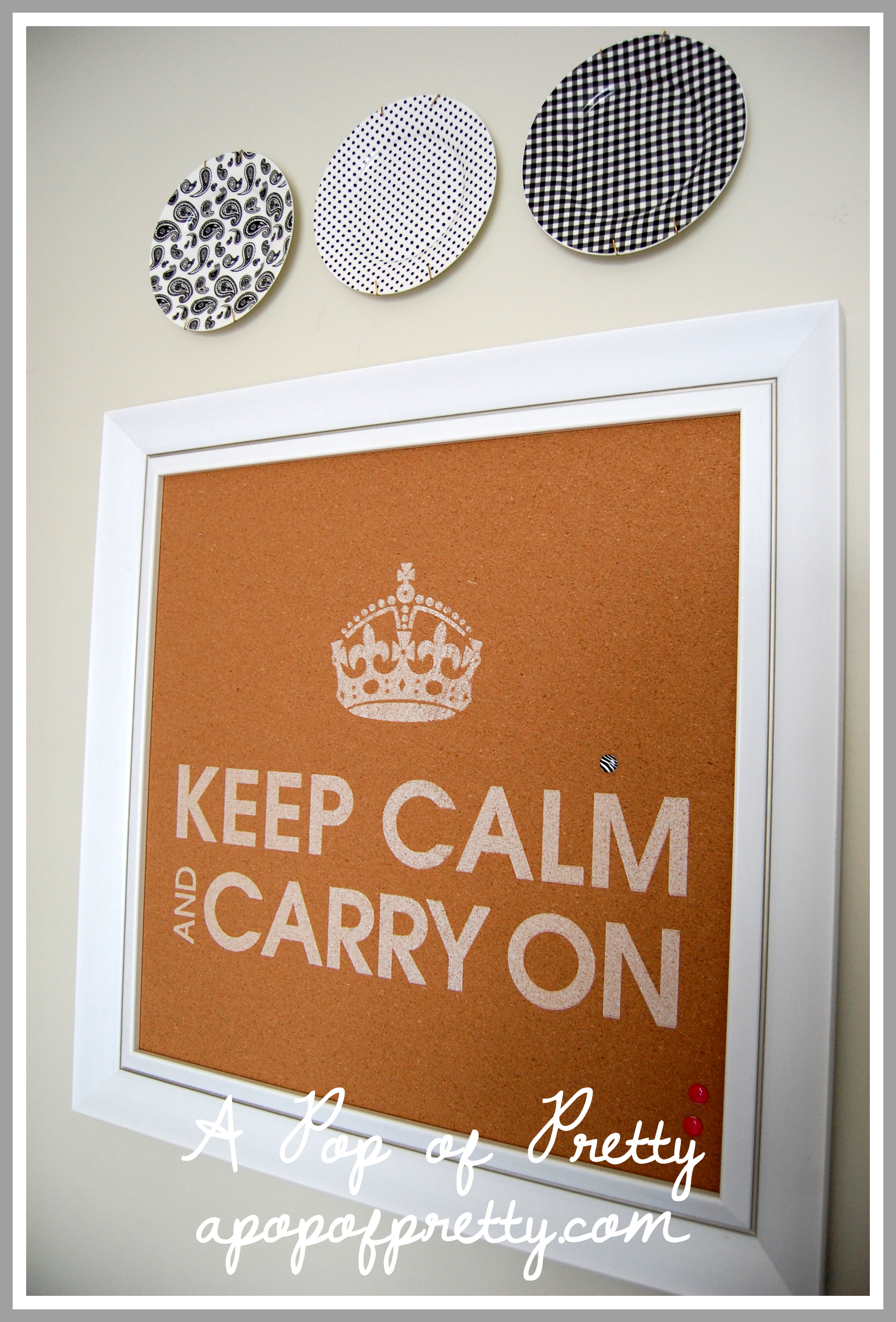 For whatever reason, since last summer I’ve gotten like a gazillion e-mails (OK, maybe more like 6, but still) about that “Keep Calm & Carry On” cork board. I didn’t stencil or paint it myself; I purchased it late last summer, again at HomeSense (here in Canada). I like it so much that I don’t even like to pin anything to it anymore, haha. Oh well, so much for it being a useful bulletin board!