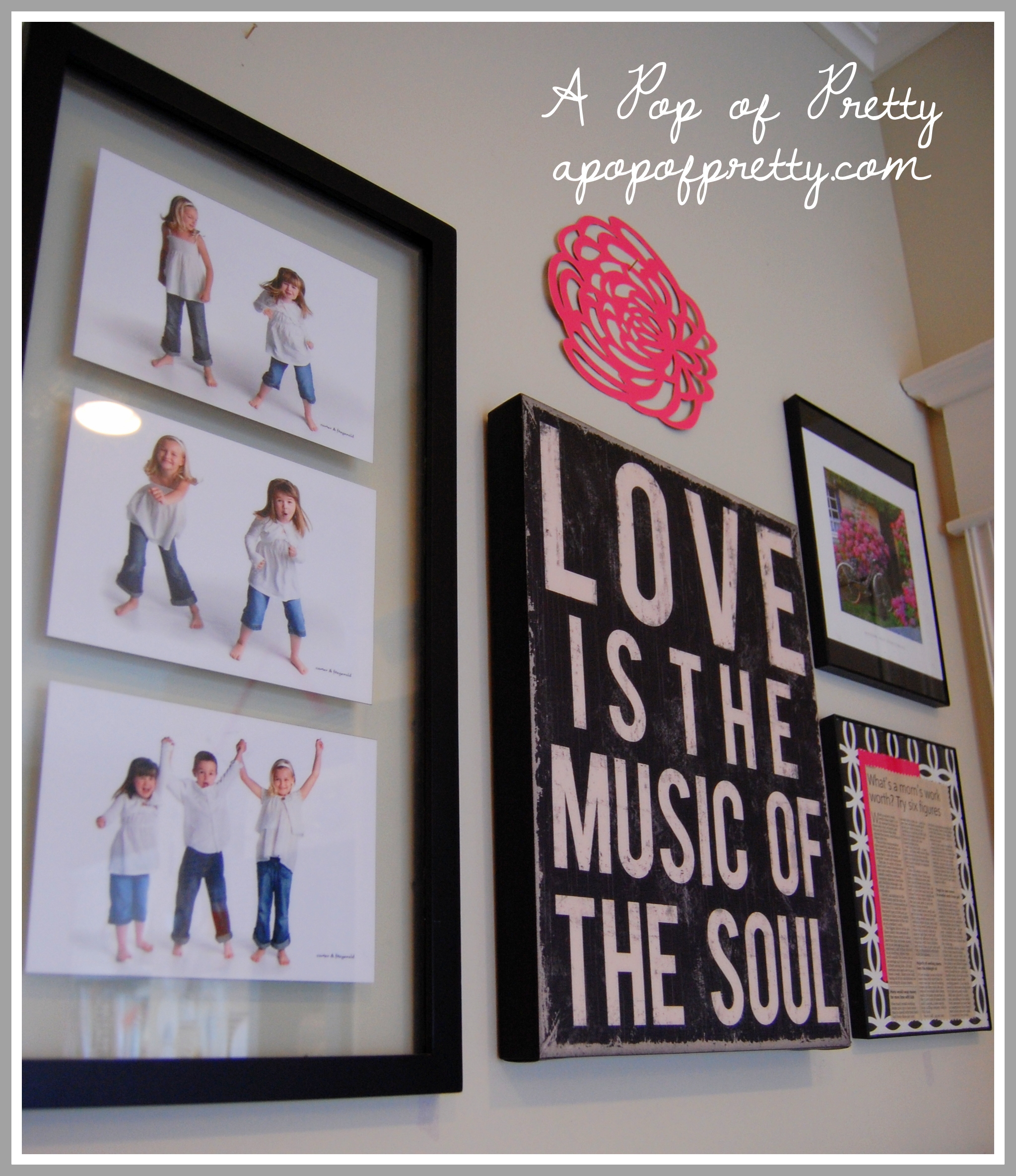 I love the piece that says, “Love is the music of the soul” since my daughter practices her singing in this room. Those awesome photos are of my daughter having fun with her cousins/BFFs.