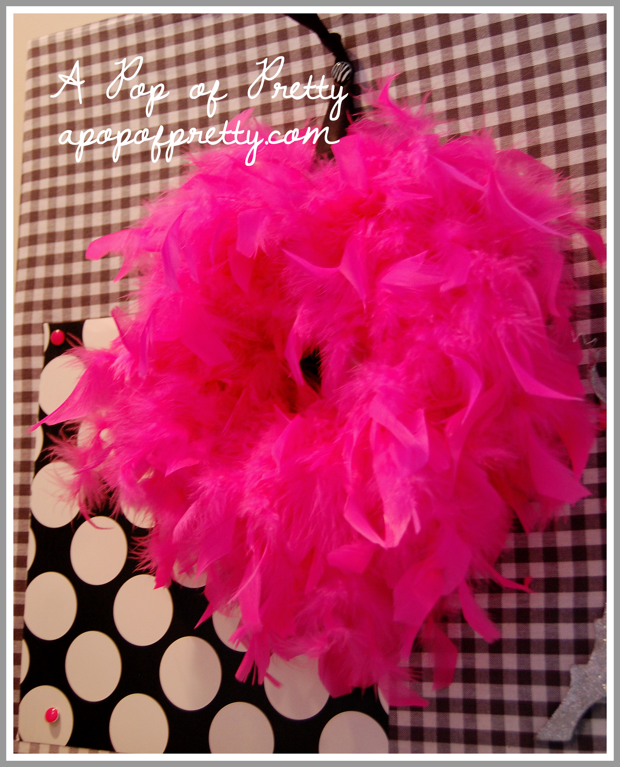 Amazingly, we still had the feather boa from the photo shoot which was almost 5 years ago. (It’s survived many a fashion show and concert around here!) But it was starting to lose its feathers, so I made a feather wreath out of it and hung it on my black and white gingham bulletin board (which I made from a shower curtain) right next to her photos.
