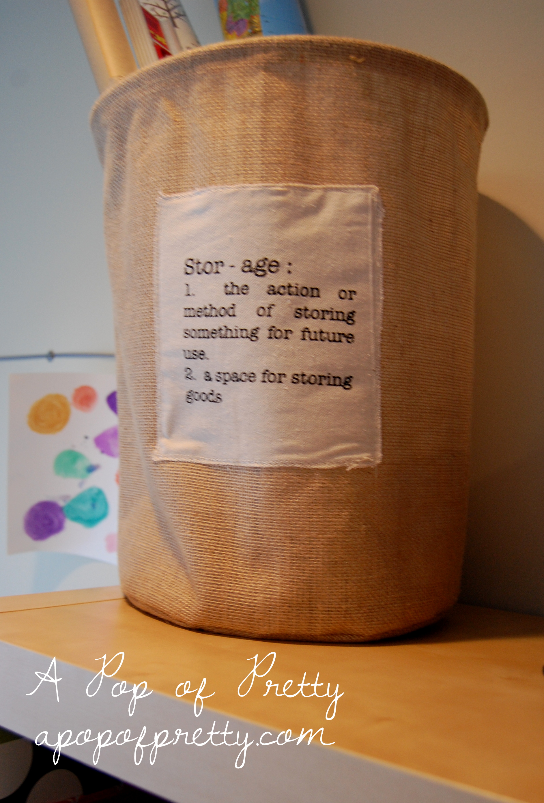 One of my faves is this cute burlap bin that is just the right height for storing wrapping paper. I found it for $10.