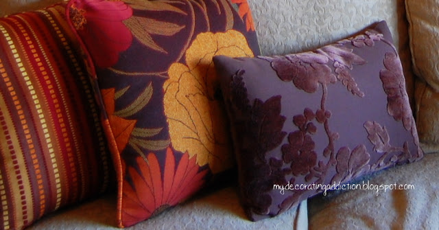 Here’s a shot where I layered on a few toss cushions with bright reds, oranges and yellows. These actually came with my new furniture in the other room. I knew when I purchased the new set that they wouldn’t work in that room, but I thought they *might* work here! I have deep red custom-made roman blinds that had to stay, and these are a great match. They are not what I would have picked if I had them made, but I knew I could live with them.
