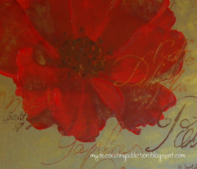 Imagine my luck when I found this piece of canvas art with a huge red, happy poppy. It was more expensive than I hoped, but it is really great quality. I find that canvas art can look cheap, but this one is a giclee print. (In giclee printing, there is no visible dot screen pattern; the image has all the tonalities and hues of the original painting). It was exactly what I was looking for.