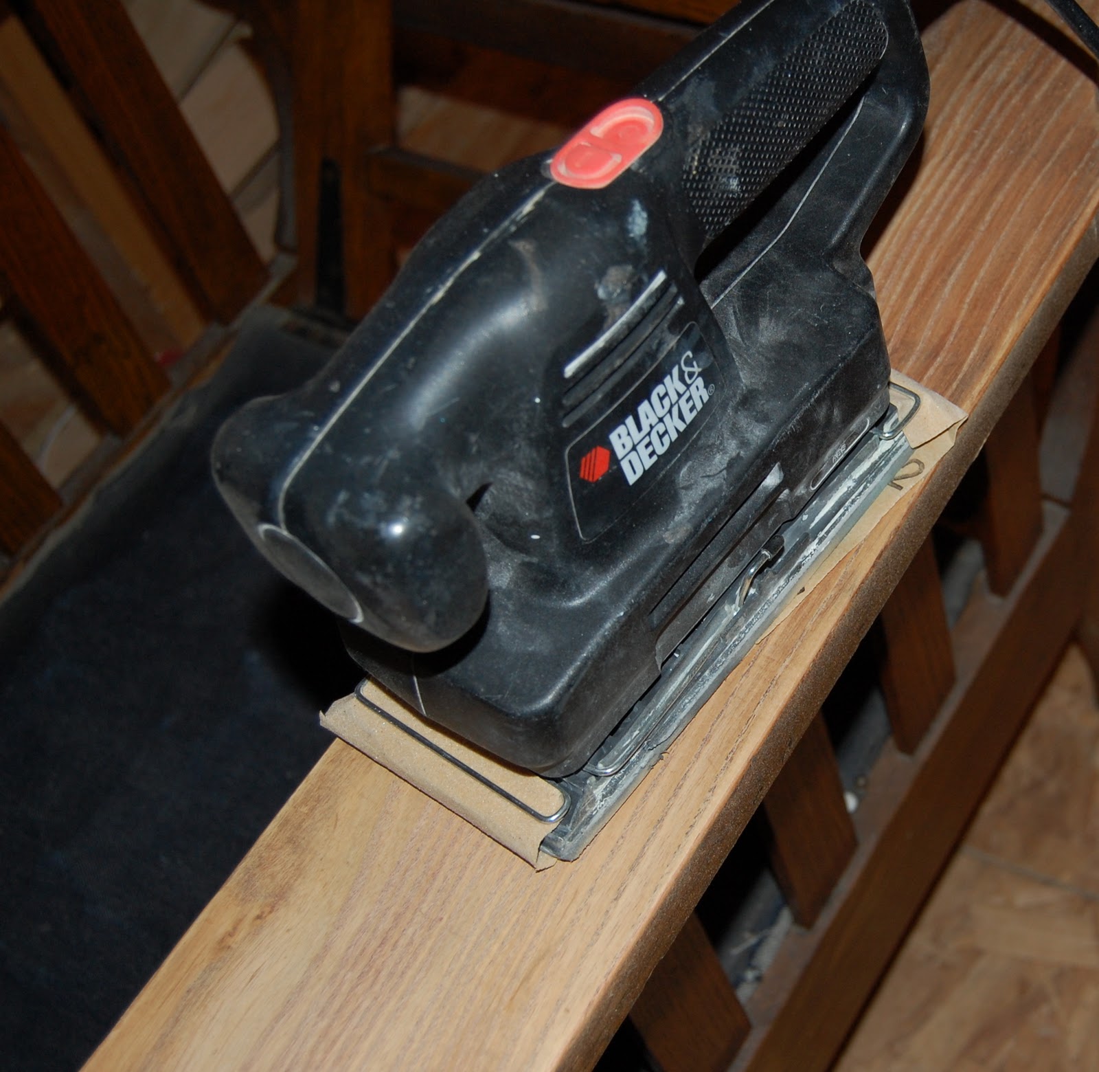 First I sanded with a electric sander, and then used sand paper in hard to reach places.