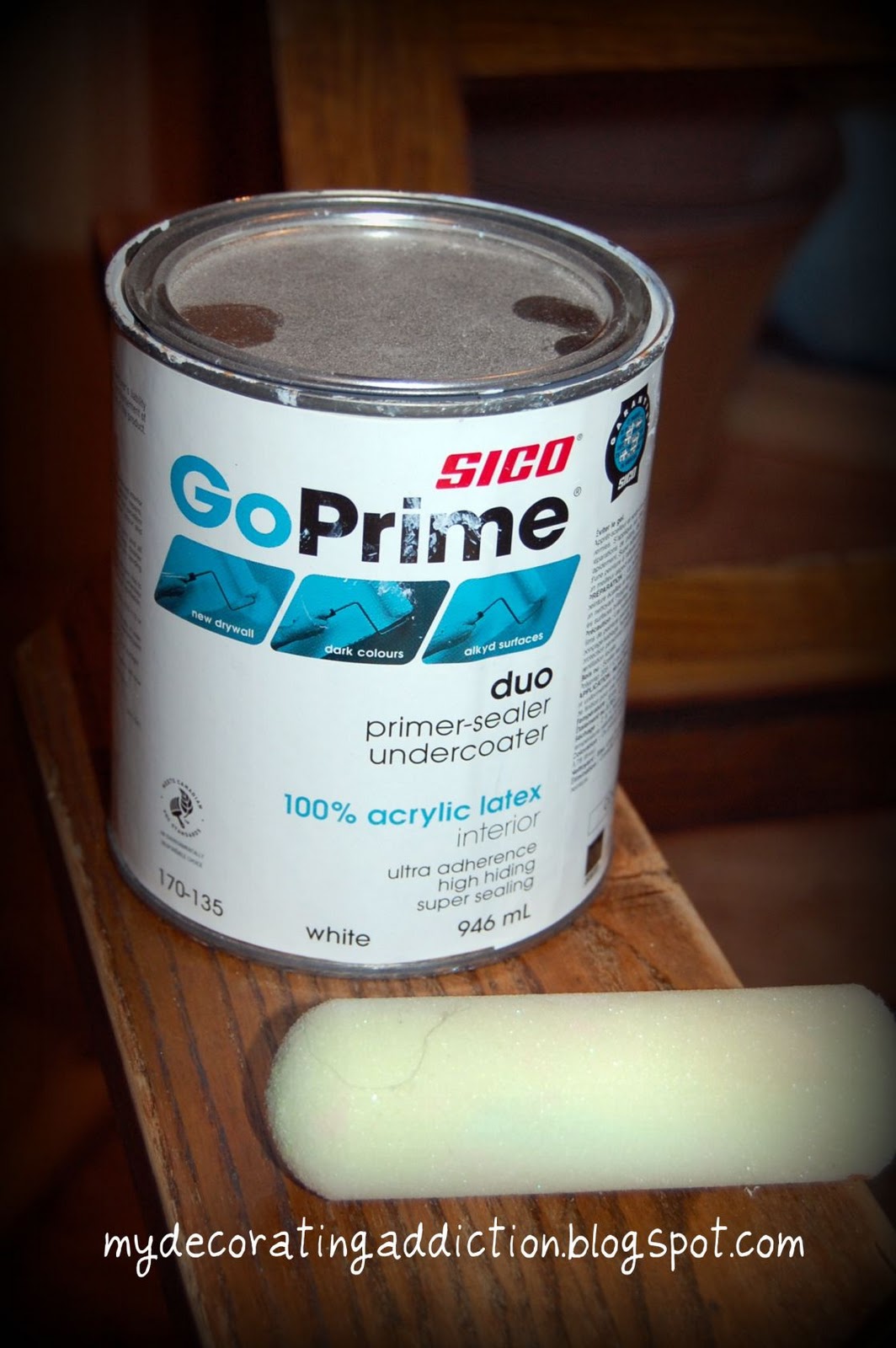 But the varnish was stubborn, so I decided that it needed primer. Once the chair was cleaned up with a Swiffer duster and then soap/water, I primed it with a latex primer.