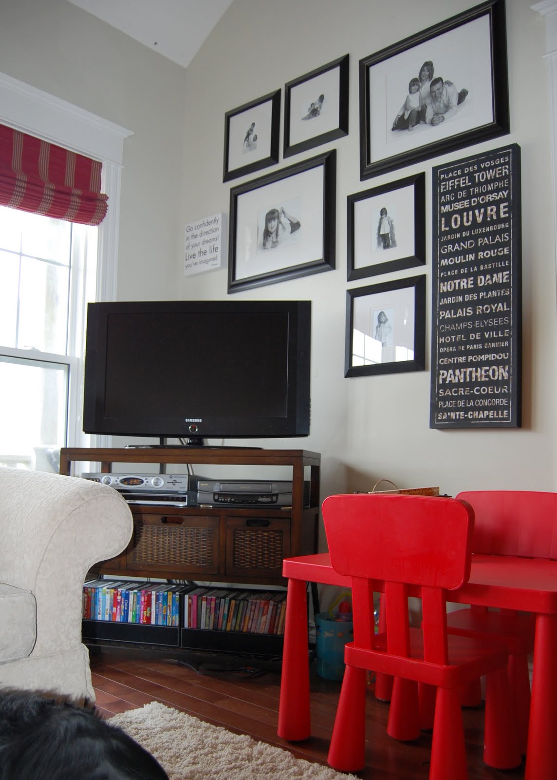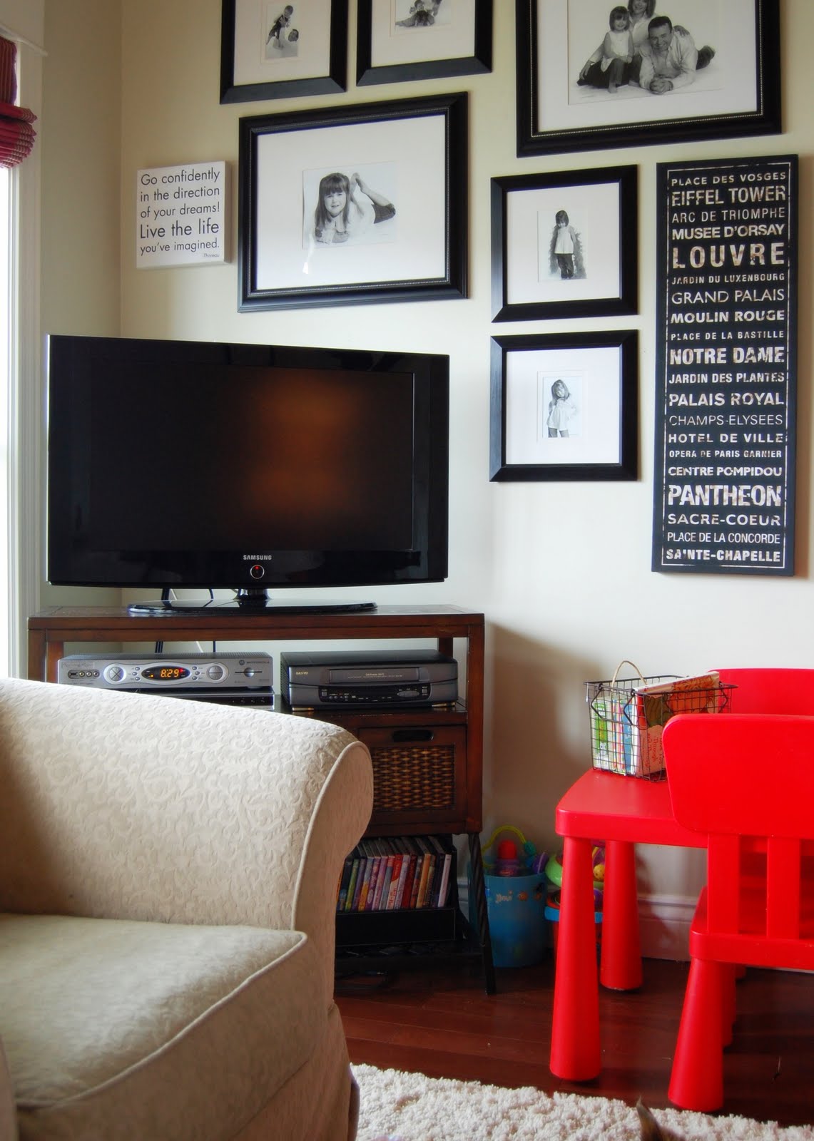 No matter what arrangement I tried, the open doors of my armoire hit a chair. The only place you could actually view the TV was from the sofa. I don’t know about you, but five of us huddled on a sofa watching a movie doesn’t sound like it’d be much fun after 5 minutes.