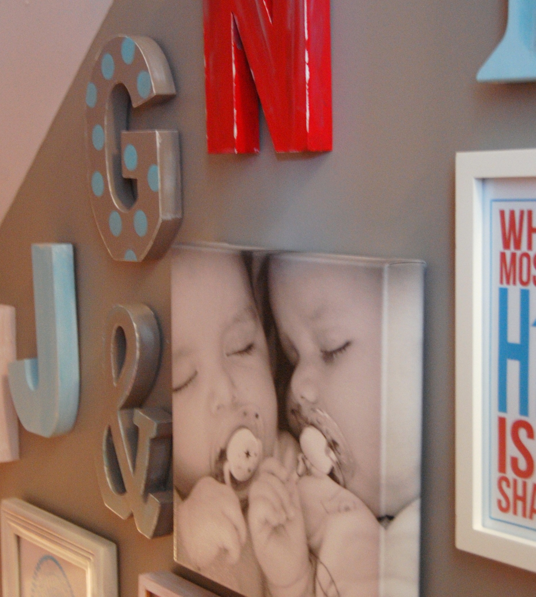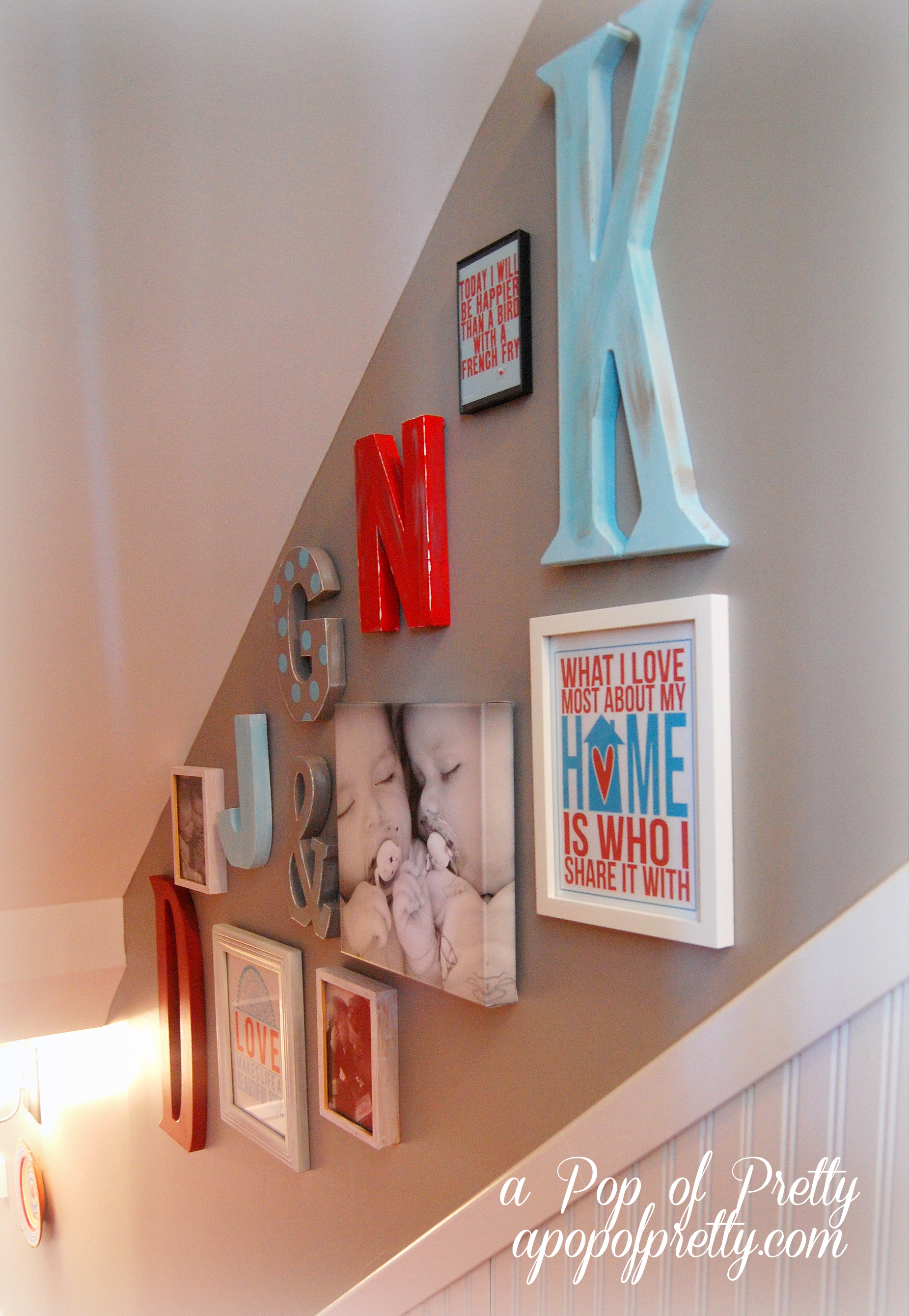 So tonight I thought I’d throw a few more ideas into the mix by showing you the ‘alphabet’ inspired wall in our basement stairwell again.