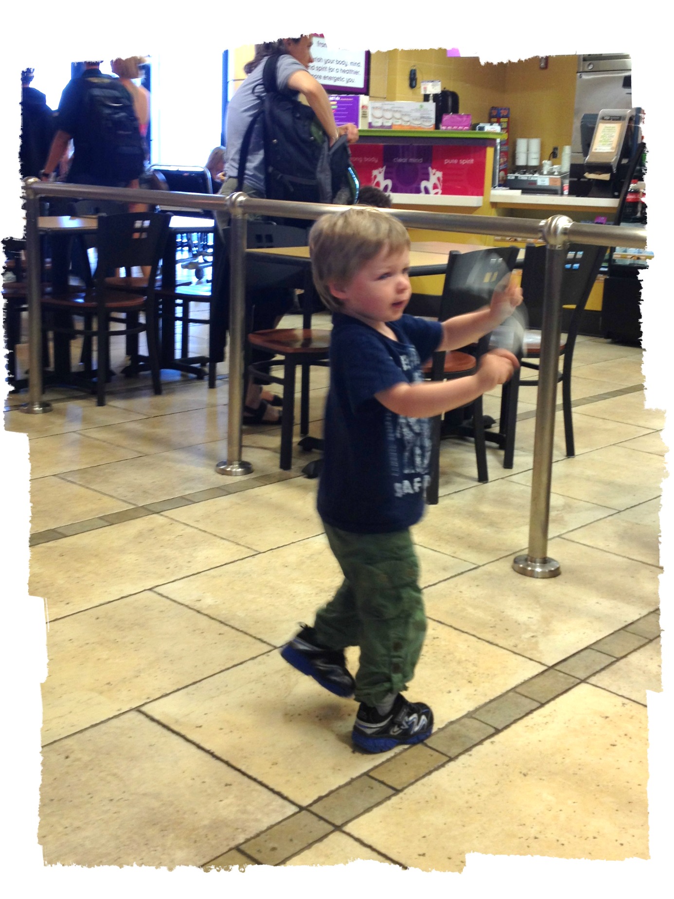 A 2-year old sitting in the same spot for 3.5 hours = monster alien beast. So don’t miss any opportunity for them to burn off their boundless energy. Let them hold your hand and run with you to catch your connection, rather than strapping them in a stroller. (Unless of course, they run like a snail, lol). And, if the mood strikes them, let them dance to Nicki Minaj’s Starships right in the middle of the busy airport restaurant. (Quick refresher from above: “Lower your Standards” lol)