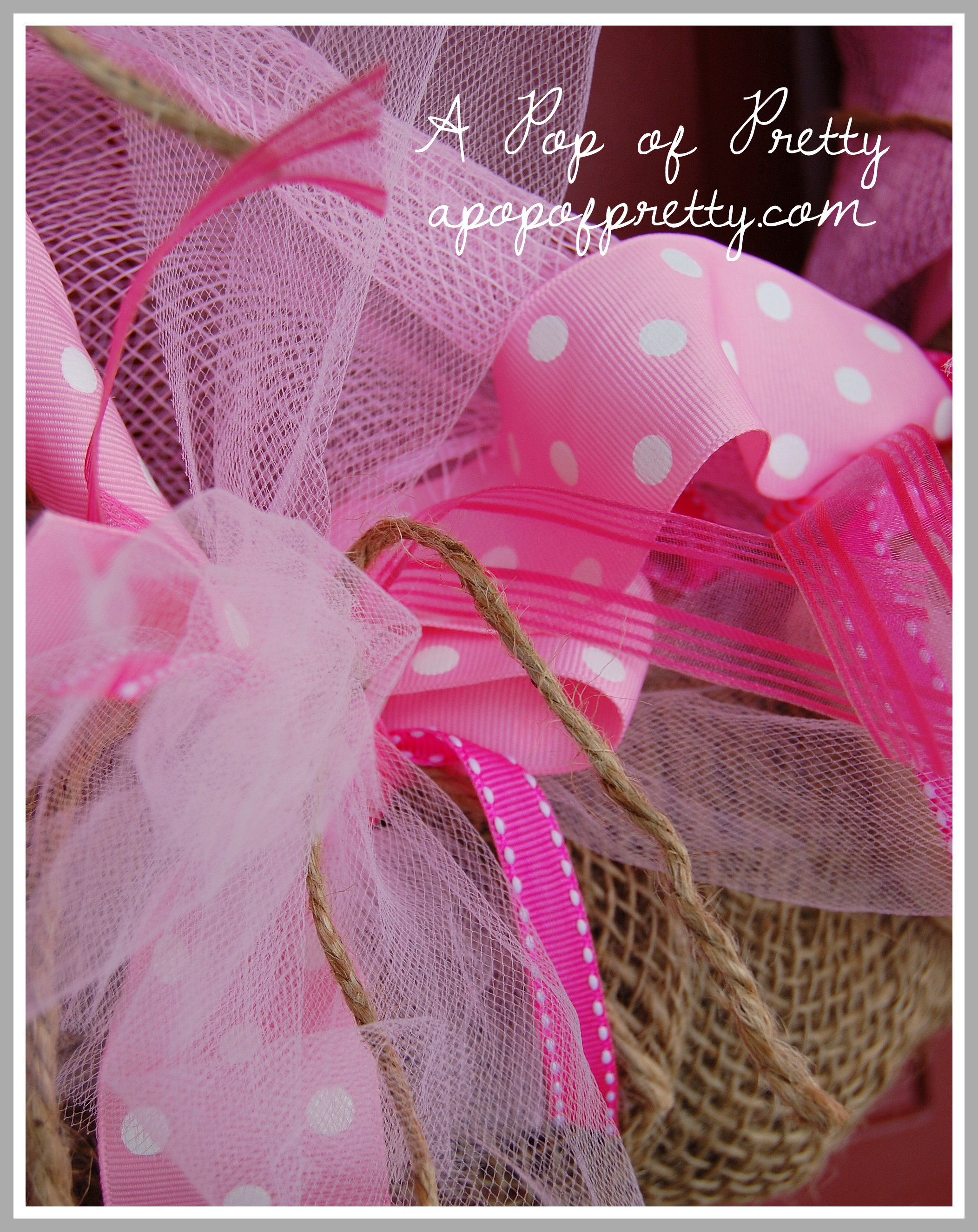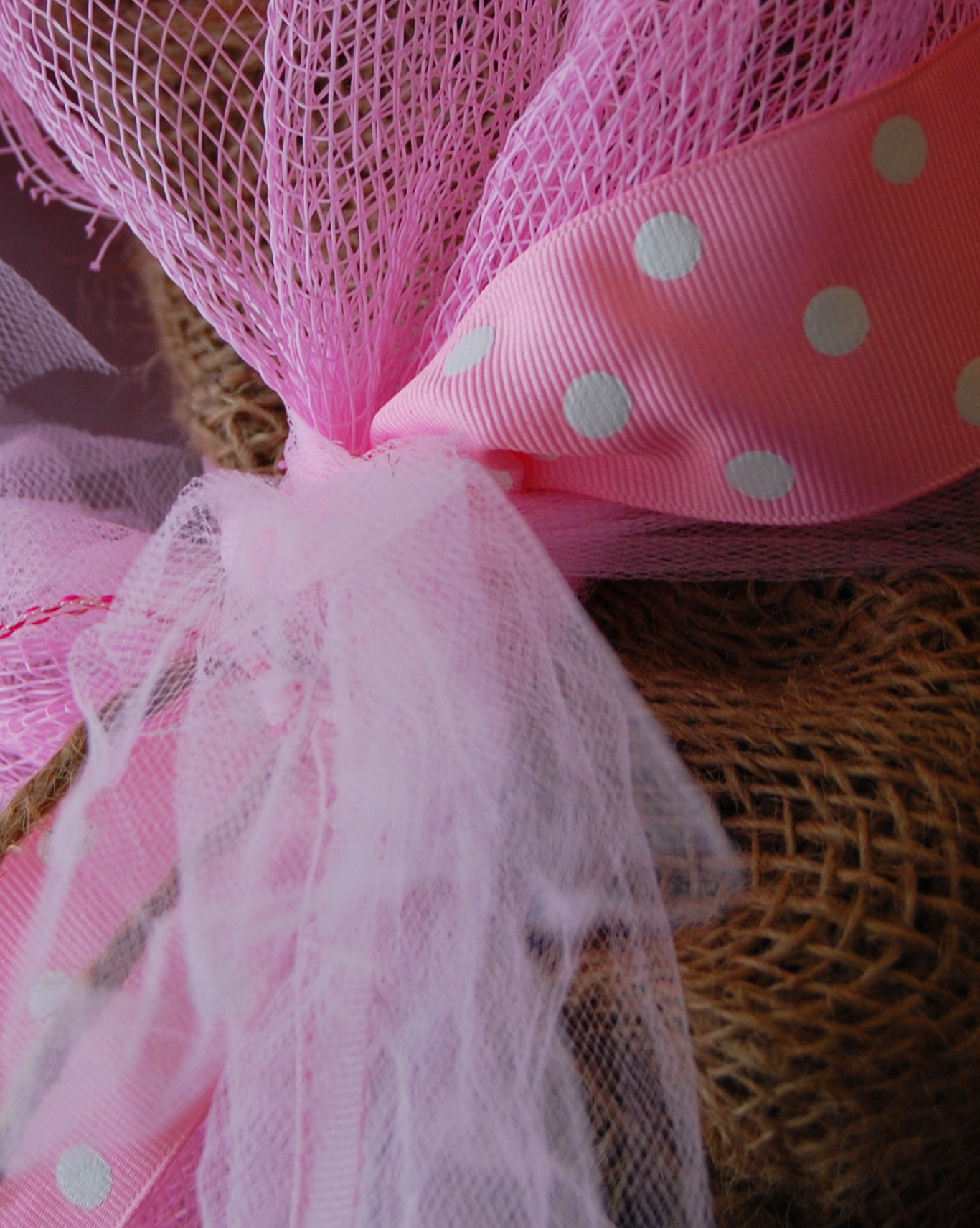 - THIRD: At each of the 7 ‘wraps’ of deco mesh, I pinched it and tied it with several strands of ribbon, tulle and twine. I kept layering on more strands until it looked nice and full at the ‘pinched’ area. Again, there is no ‘right’ or wrong way to do this! In the photo below, you can see how I started with the wide polka dot ribbon, then the tulle. You can use any style of ribbon you like, but mine included two types of narrow grosgrain ribbon, a wide polka dot grosgrain ribbon, a medium sheer ribbon, a medium burlap ribbon, twine, and pink tulle.