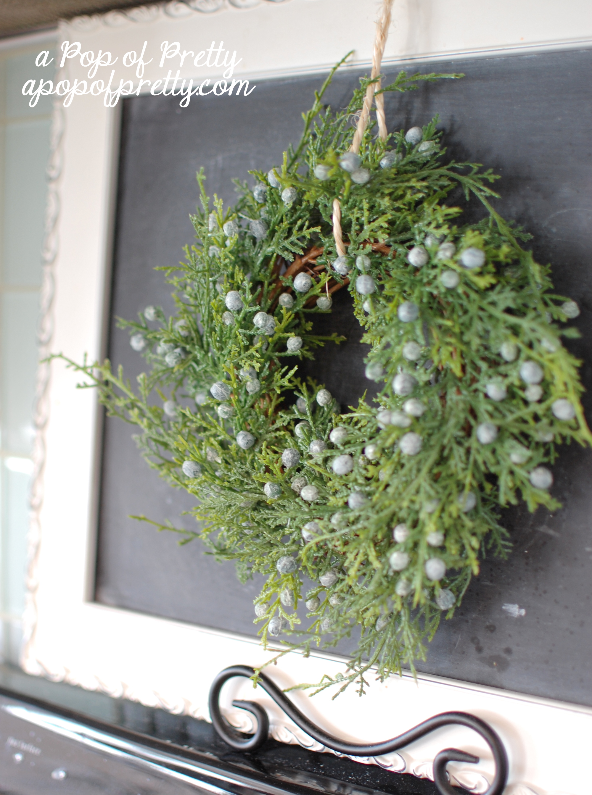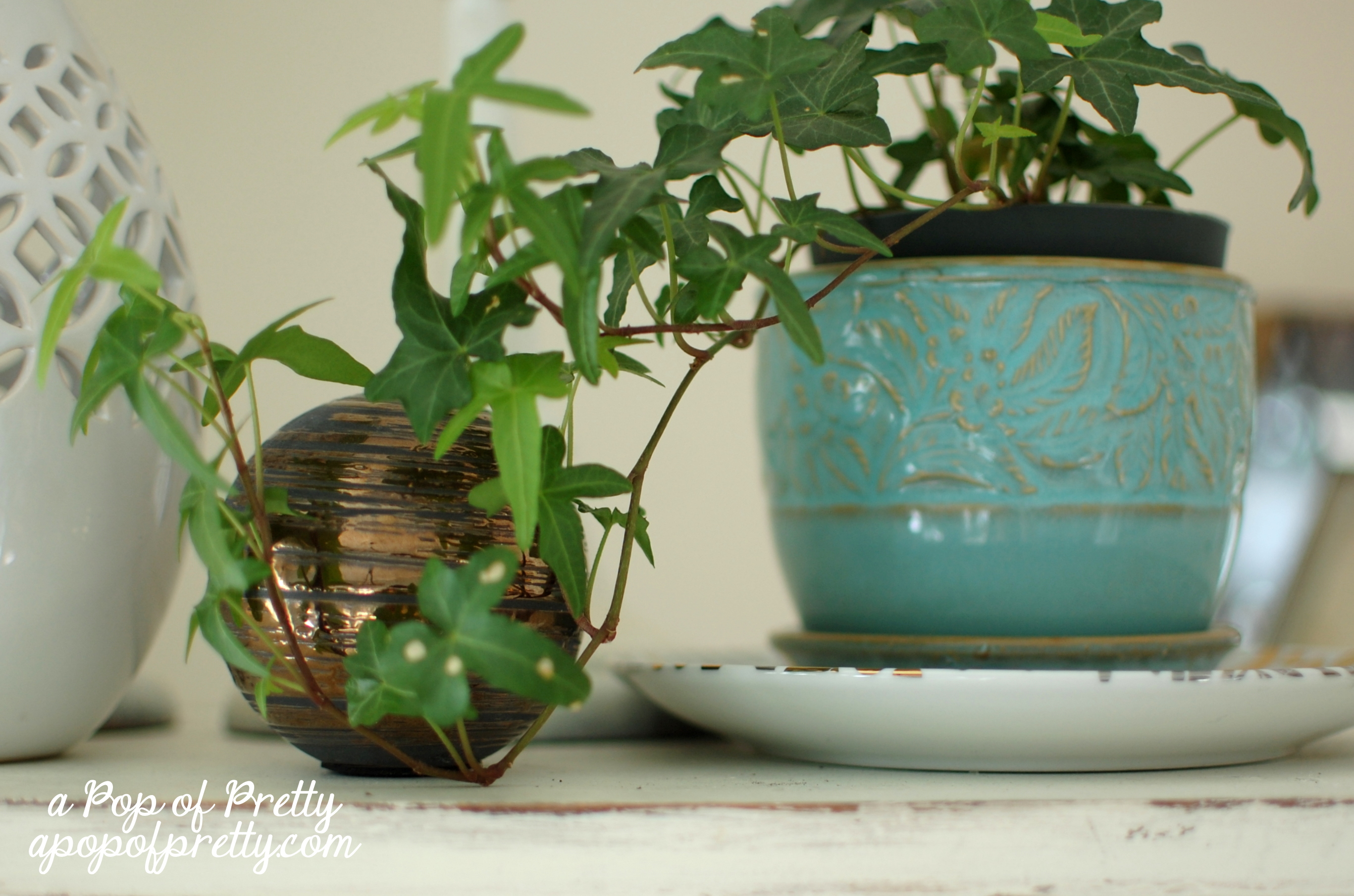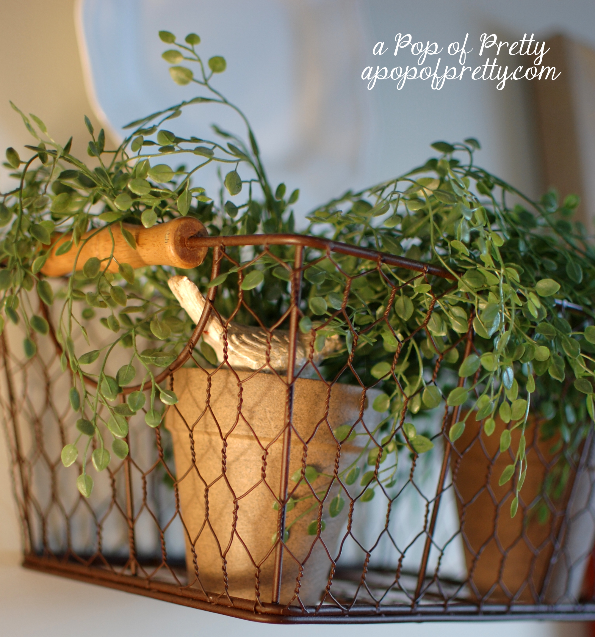 Without greenery outside, I usually resort to getting my greenery fix by adding a few artificial plants and wreaths here and there. I am ashamed to say that, in this home, which we’ve been living in for over 5 years, I don’t think I’ve had even one living plant. {Well, except for Miss G’s lima bean sprout when she was in Kindergarten. Does that count? OK, maybe not. 😉 }